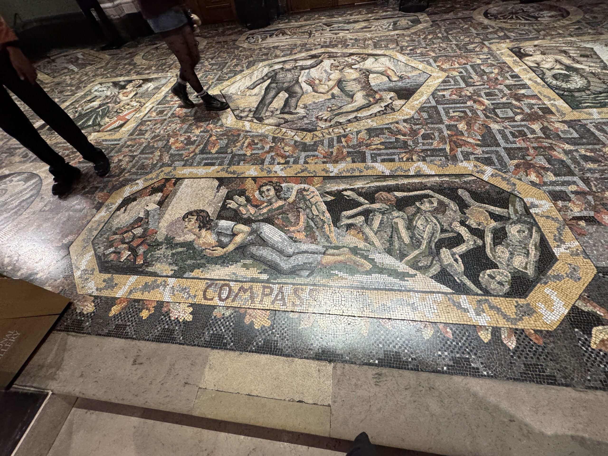 Раньше я уже была в Нацгалерее и мозаики Анрепа на полу интересными не посчитала. Рассматривая позже фото в интернете, когда узнала, что мозаик много, что прообразом для одной из них послужила Ахматова, я думала мозаики все отдельные, и с Ахматовой отдельная тоже. Но все сюжеты были частью больших мозаик на двух этажах, Анна на втором. Слепленные друг с другом в большой ковёр, они походили на странный безвкусный конгломерат.