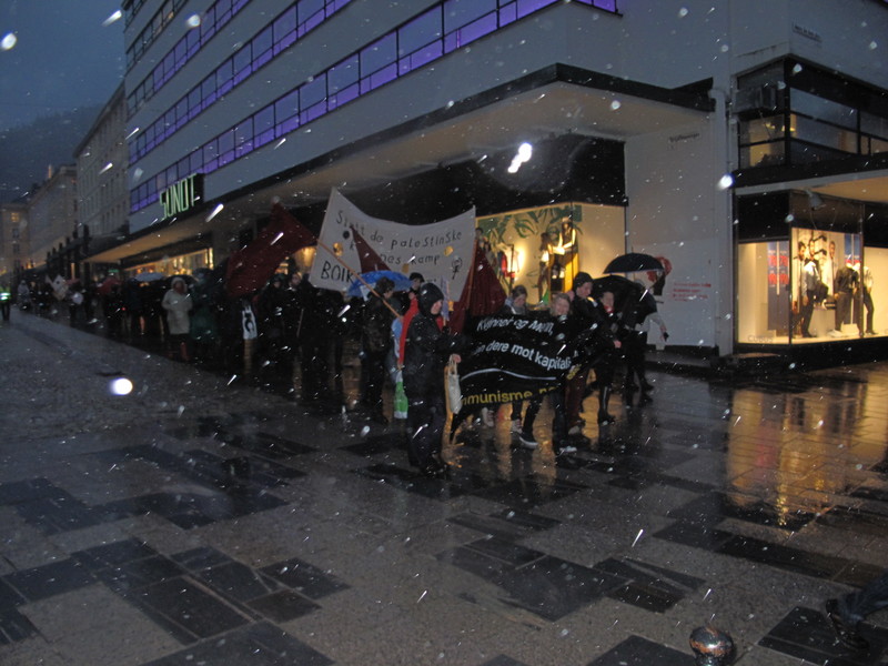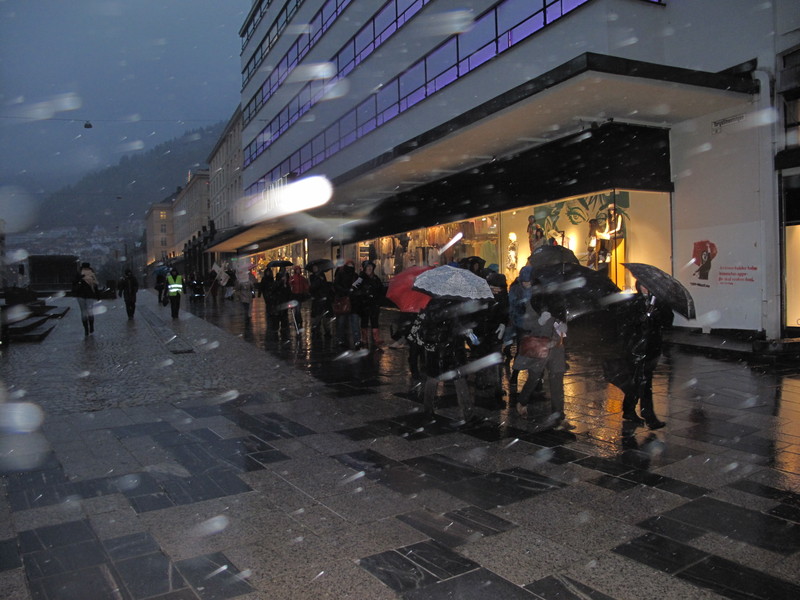 Активистка фнб из Сан-Франциско говорила: «Когда нас покидают силы и мы не можем больше проводить акции, мы вспоминаем, что русское фнб раздает еду в снегопад…» Так вот если бы калифорнийские ребята побывали на рядовой бергенской акции в дождик — вернее, в ураганчик — они бы вообще очень ускорились. Снег? Да это ерунда!