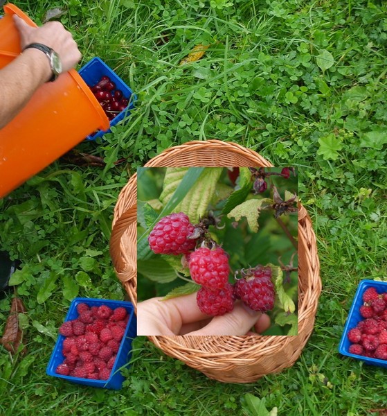 Мы собрали полкорзинки вишен и полкорзинки малины — ягоды все были очень хороши. Хозяйка совершает замер и мы платим крошечную сумму. Столько же, сколько стоит одна коробочка норвежской черешни в магазине. Кстати, хорошая вишня в магазине — это редкость.