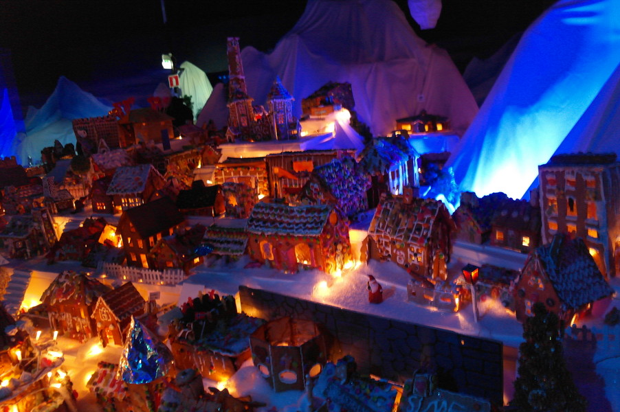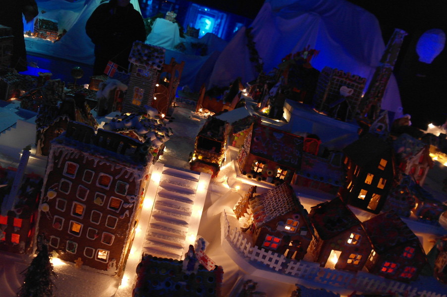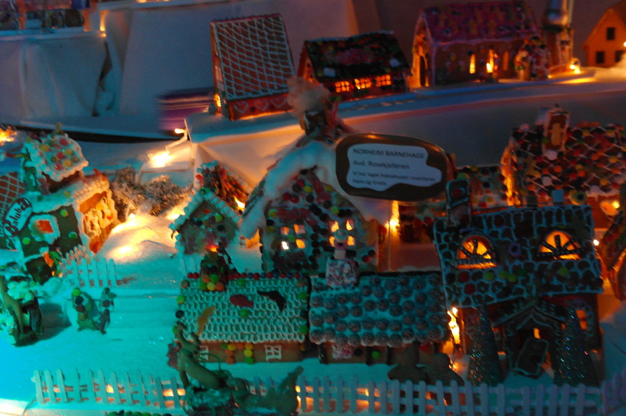 Городок располагается на Торгаллменнинген и в этом году он заметно меньше. Но всё равно можно посмотреть много интересного печенья. Из имбирного теста созданы корабль «Фрам», жилища инуитов, собачьи упряжки. Есть несколько Эйфелевых башен, воздушные шары, аэродром, стадионы с футболистами и Юлениссе с оленями. Муми-троллей представляет единственная одинокая муми-мать, стоящая на берегу озера. Видимо, в прошлом году перепекли муми-троллей. Как и всегда, домики больше интересуют родителей, а дети бегают за паровозиками, которые ездят по туннелям и по горам.