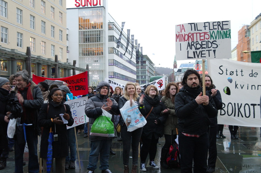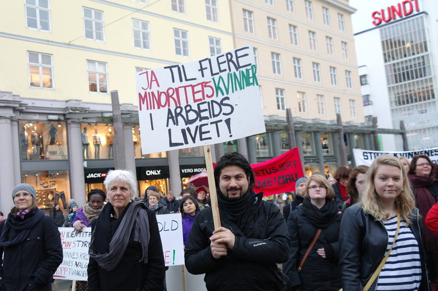 Али Ватти (Norsk Folkehjelp Solidaritetsungdom Bergen) держит плакат, призывающий работать женщин миноритарных общин.
