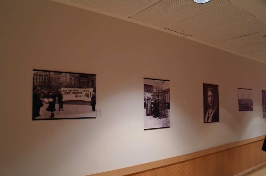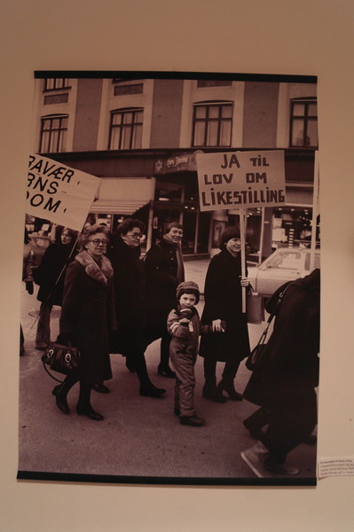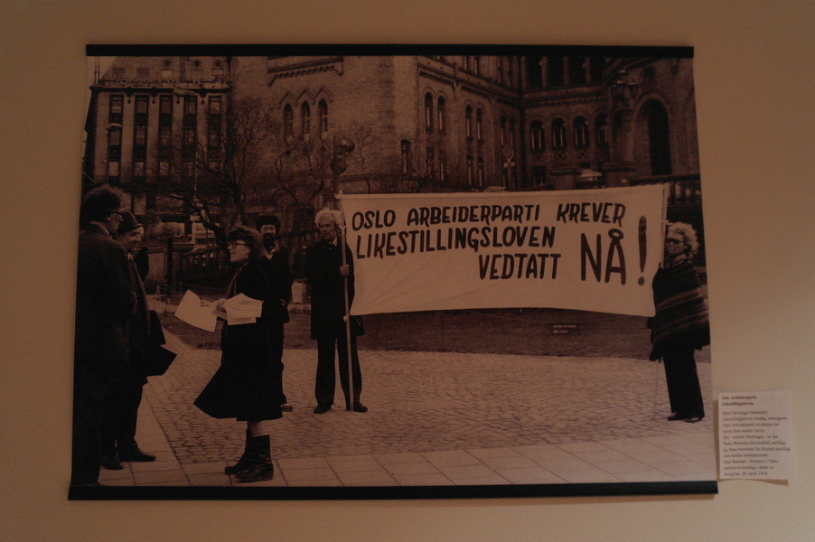 Рабочая партия Осло требует немедленного принятия Закона о равноправии. Peder Berntsen (партийное отделение Grafisk) и Aase Sørensen(партийное отделение Rustad) стоят с транспарантом около Стортинга. Kari Bolstad — лидер женского движения в Осло — раздаёт листовки. 28 апреля 1976 года.