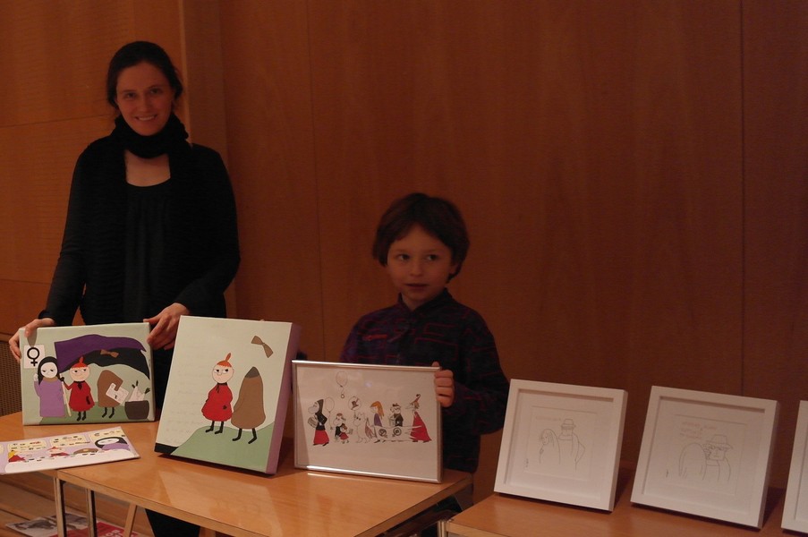 Эти фотографии мы сделали в перерыве между выступлениями. Маленькая выставка рисунков на фемтему располагалась в конференц-зале, у стены напротив сцены. Здесь две новые цветные работы: