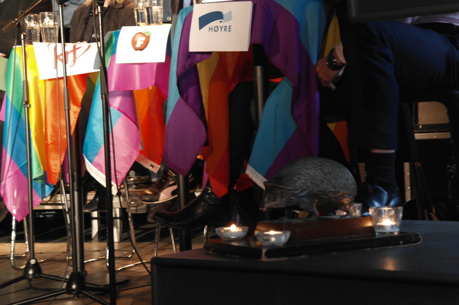 Обратите внимание на ежа около представителя Правых. Это старинный символ бергенского студенческого общества, которое и организовало дебаты. В начале таких важных мероприятий ежа торжественно вносят в зал. Вы могли видеть памятник ежу около университета.