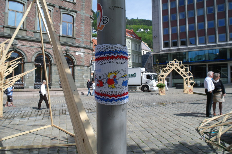 Обвязывание действительно редко встречается в Бергене. Ярнбомбинг — феминистская альтернатива грубому граффити.