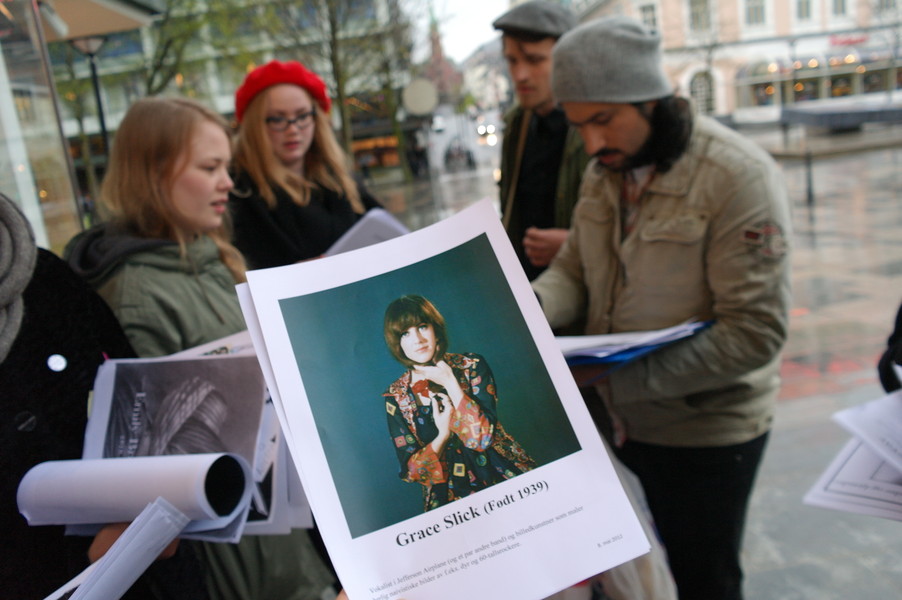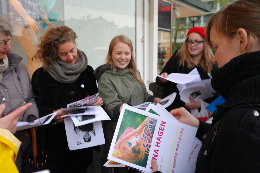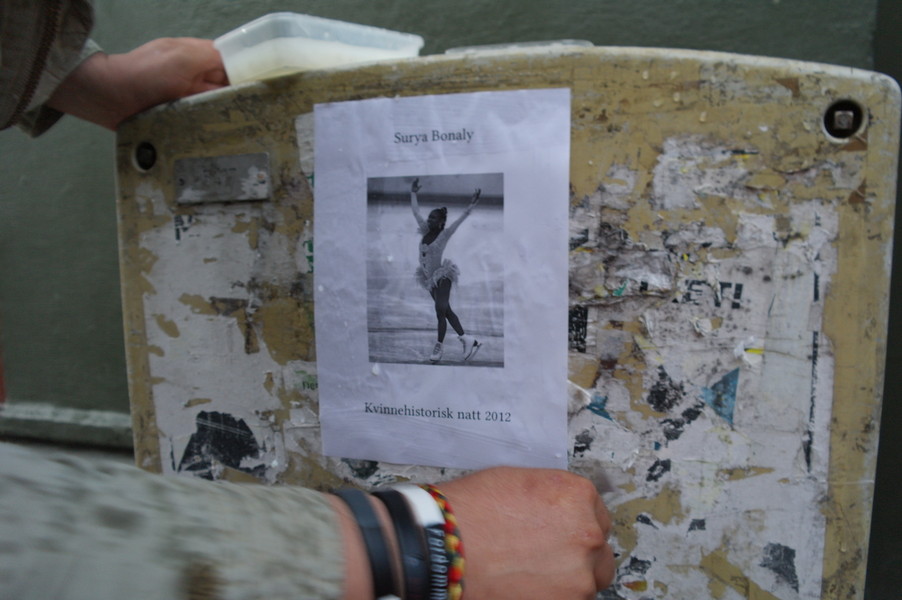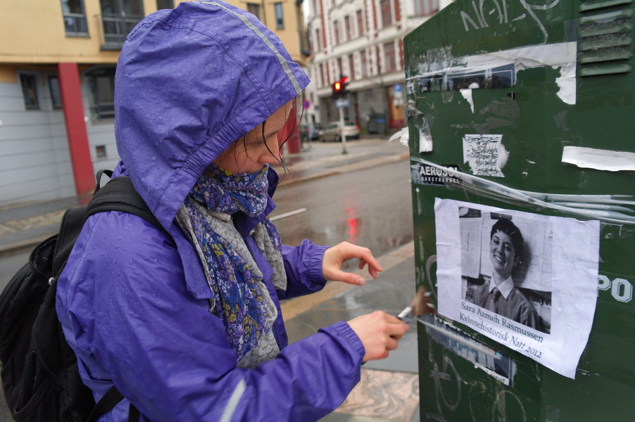 I kveld har både kjente og ukjente møtt hverandre på Torgallmenningen i øs pøs regnvær og byttet plakater av kvinnelige heltinner som ellers er fraværende i det offentlige rom. Deretter klistret folk i grupper plakater rundt i byen. Under Jon Smørs broen ble det laget et galleri av alle heltinnene. Inger Merete Hobbelstad, Loretta Lynn, Kate Bush, Emma Goldman, Susanne Sundfør og Liv Ullmann er noen av kvinnene du kan se på plakatene under broen. «Kvinners trygghet henger sammen med hennes status, som et skritt på veien skriv historien på ny.» Albert og Elise.