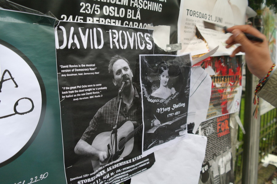 Дождь то стихал, то усиливался. Фотоаппарат кричал: «Только не это, снова вода!» Если бы у нас было больше плакатов, они бы просто растворились. Последние плакаты были уже совершенно прозрачные, когда мы их клеили.