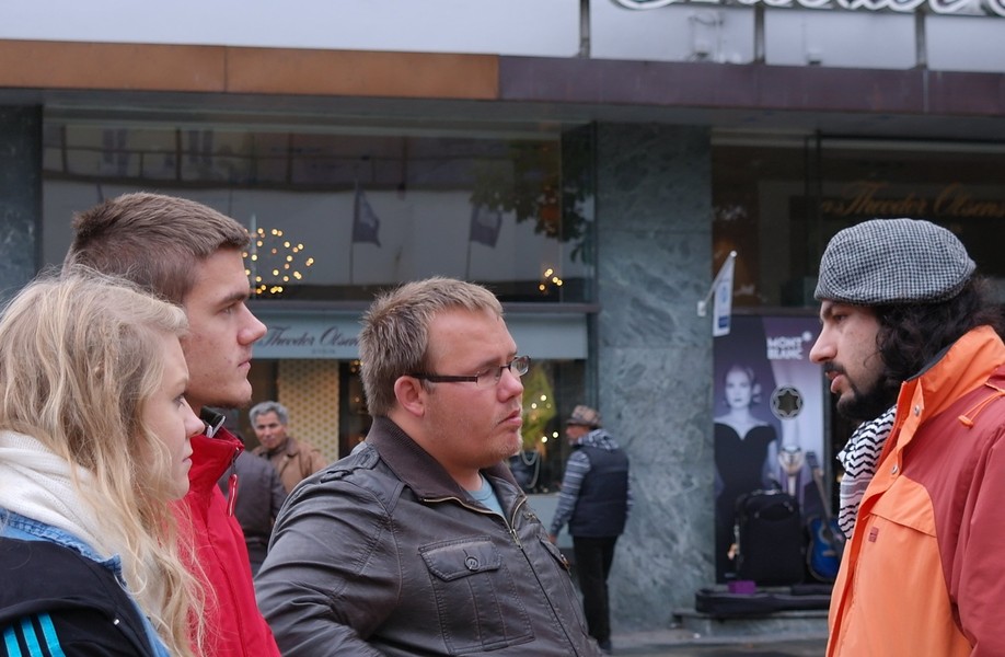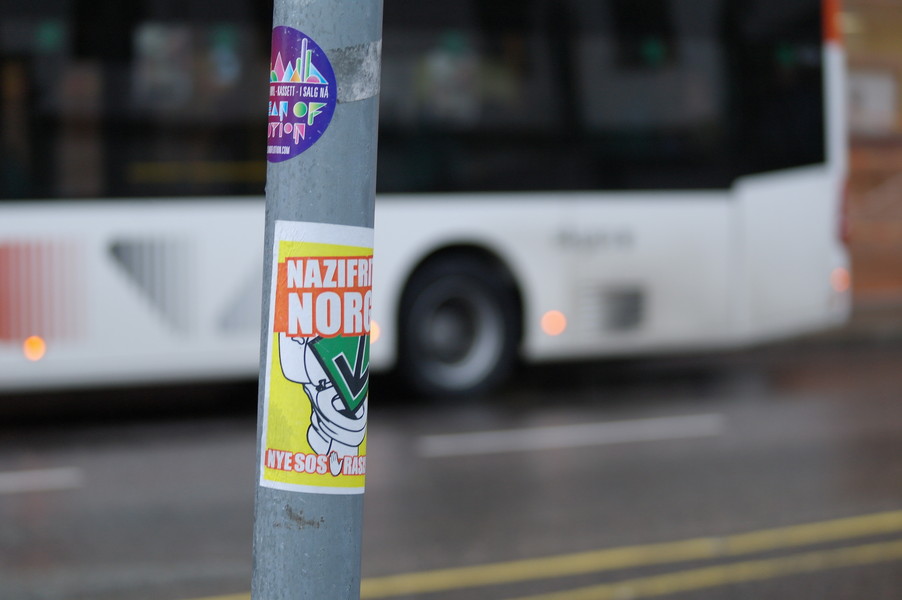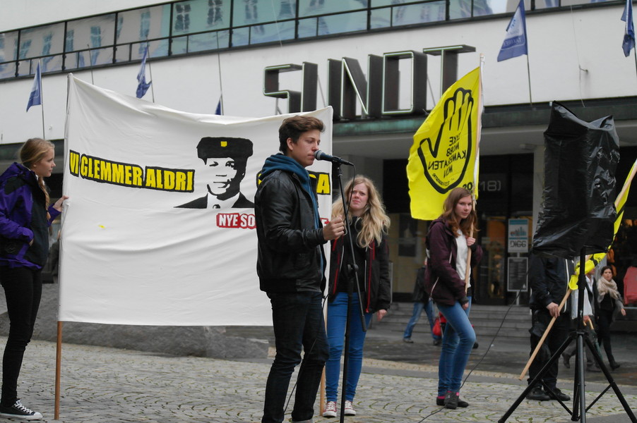 Был транспарант, звукоусиление, пел Balle Malurt, популярный у местных активистов музыкант. Говорили Åsmund K. Hatlestad из Сос Расизма, Kristian Kvalvaag  от Красных. Али Ватти рассказывал о том, что сейчас расизм проявляется по отношению к беженцам, приводил в пример случай с Ибрагимом, когда скорая приехала в лагерь беженцев через 40 минут после вызова. И случай с Гаролин, совершившей самосожжение вместе со своим ребенком после того, как ей было отказано в убежище и предписано вернуться в Шри-Ланку — как раз после того, как в Шри-Ланке была убита сестра Гаролин.