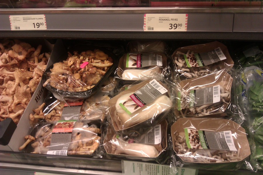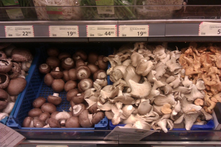 В бергенских магазинах раньше было сложно отыскать хорошие грибы, которые не были бы шампиньонами. Теперь в сети магазинов можно насчитать семь видов свежих грибов. Замороженные грибы бывают в единственном виде — пачка шитаке, шампиньонов, лисичек. Сушеных грибов бывает видов 6.