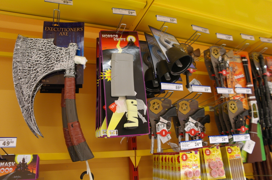 А это очень нужные каждому ребенку игрушки. Топор палача и хоррор-нож, а также пистолет и крюк для культи. Традиционные ружья-пистолеты я просто не фотографировала. Их целые стенды.