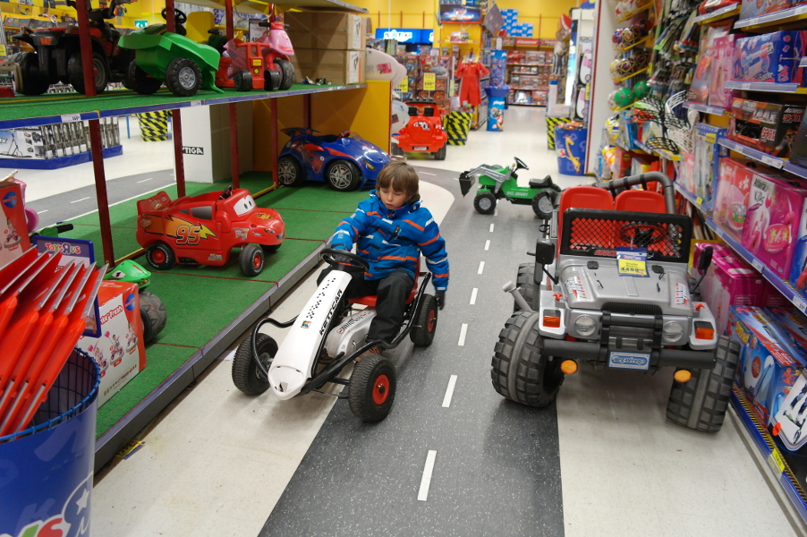 Также в магазине есть отдел машинок. Мы не можем купить такую машинку, потому что нам негде ее хранить и вынести на улицу или занести в подвал любую из моделей было бы проблемой. Самая большая из машин габаритами шире двери нашего подъезда.