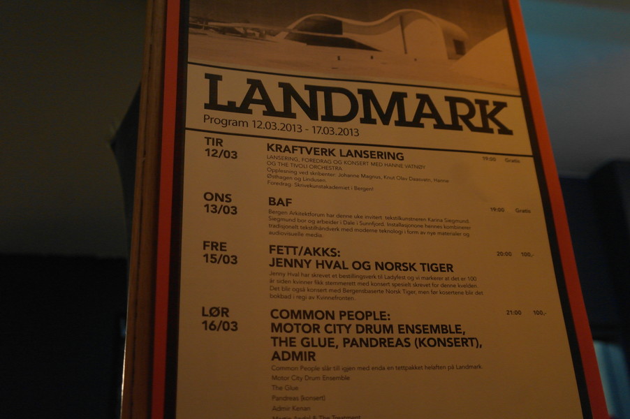 15. mars 2013 в 22.00 в зале Ландмарк начался концерт Jenny Hval и Norsk tiger. Jenny Hval очень известная в Норвегии журналистка, писательница и музыкант. Сайт jennyhval.com рассказывает про талантливую девушку.