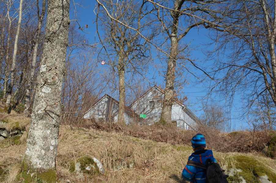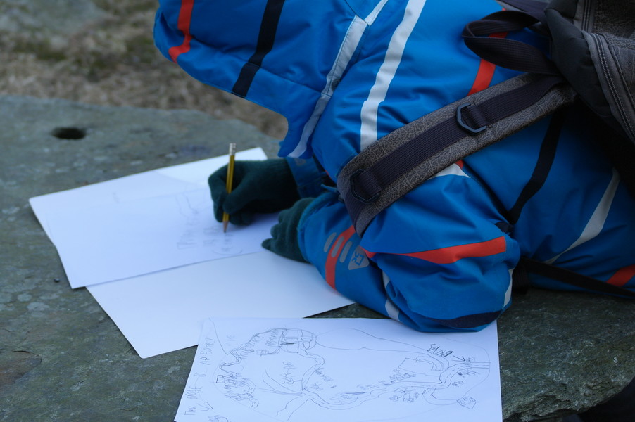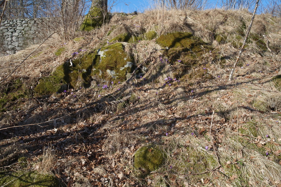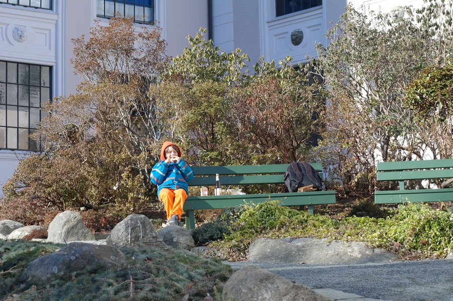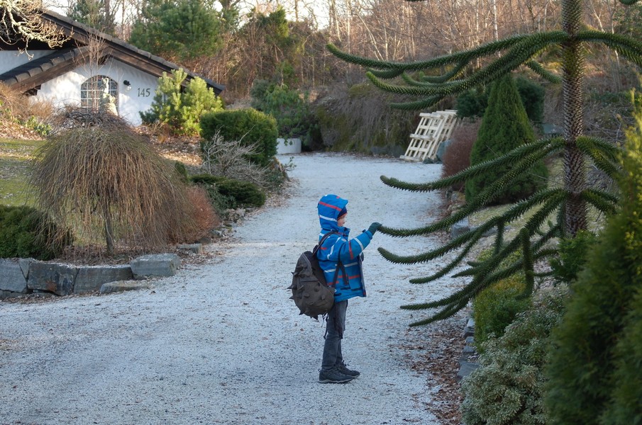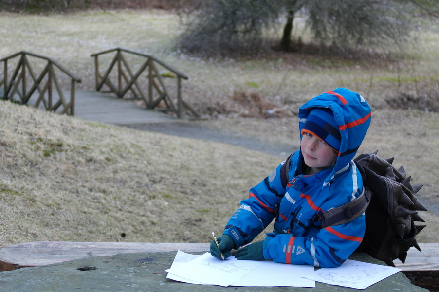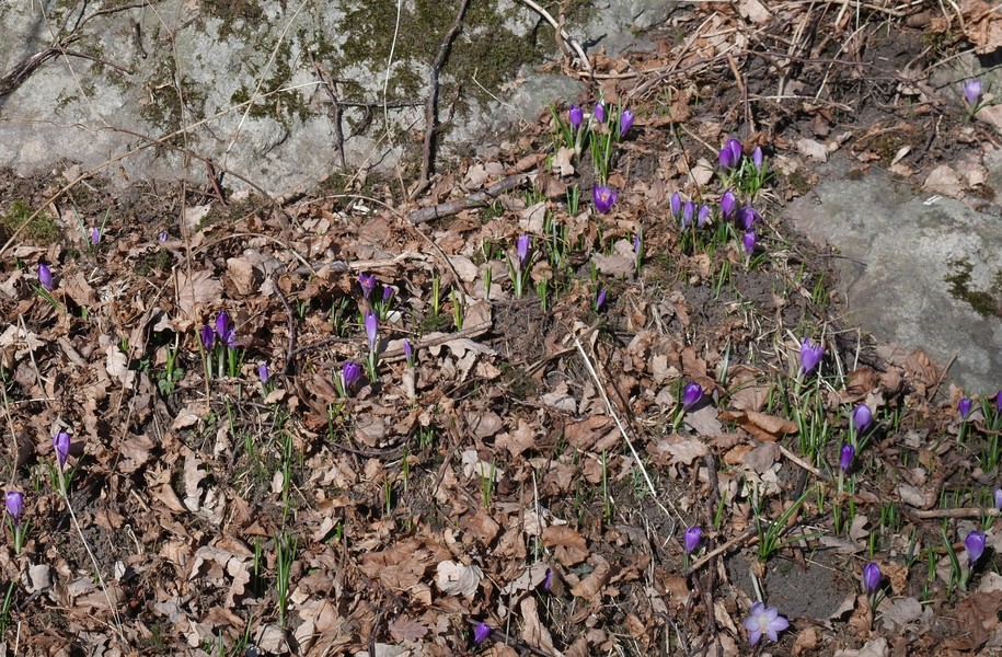 Мы обнаружили, что большие кусты красной смородины около входа в парк вырубили, а крокусы действительно выросли и начинаются практически сразу. Вот Терентий начинает составлять свою карту весенних цветов: