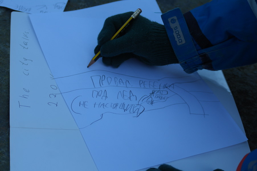 Терентий записывает, как под его ногой треснул лёд над овражком: