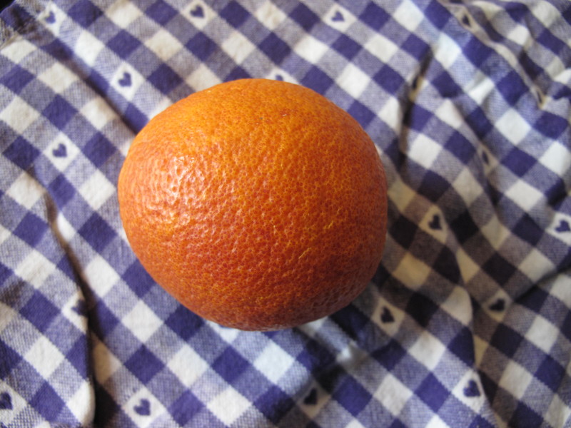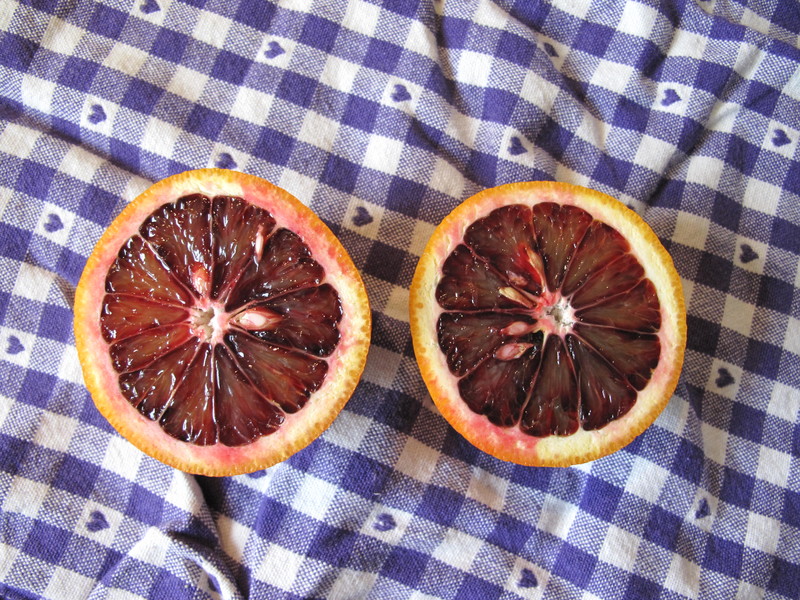 Следующий номер нашей программы — редкий гость в Бергене, кровавый апельсин (Citrus sinensis). Апельсины лежат в корзиночки около кассы в Рейндирке.
