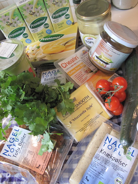 Тофу с базиликом, тофушарики, «куриная» колбаса, тофусиски. Очень хорошие (в смысле органические) помидоры, огурец и кинза (во всех смыслах хорошая) из Рейндирки. Уже упоминавшаяся выше сезамовая паста тахини — справа сверху.