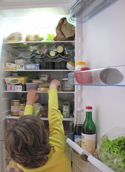 Тут гора малополезных, но веселых продуктов. Видно молоко, которое Терентий берет в школу, ванильный десерт, с которым Терентий ест ягоды, тофу, большой йогурт и моцареллу для школьных бутеров.