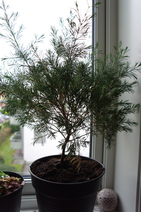 А это цветок, который мы купили маленьким за то, что он был похож на ёлку с ромашками. Считалось, что он одноразовый, засохнет через месяц и расти не будет. И вот пожалуйста, надежды пошли прахом, заслоняет окно до половины.