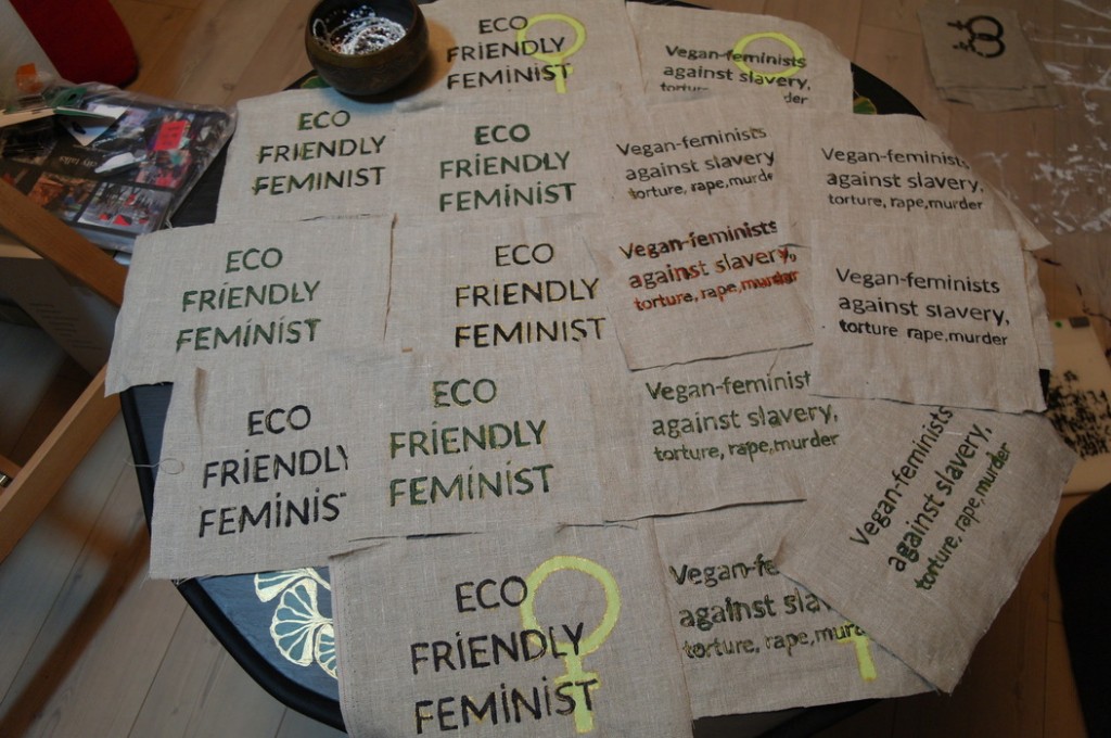 Кроме этого были веган-феминистские нашивки (я забыла сделать фото на конференции и поэтому вот вам домашнее фото):
