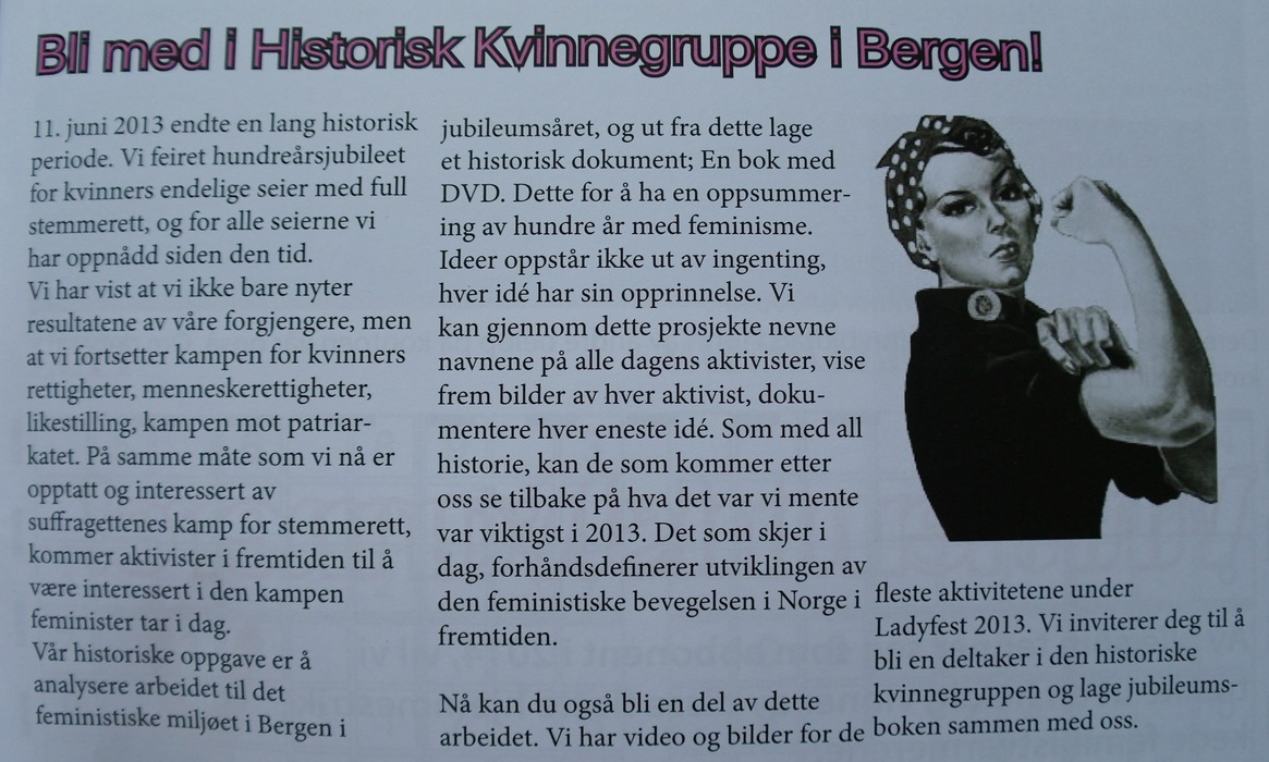 Объявление появилось в 1 номере журнала Kvinneaktivisten за 2014 год. В нем говорится о том, почему важно сделать книгу о 100-летии права норвежских женщин голосовать (речь идет о феминистском фестивале 2013 и некоторых других ключевых феминистских акциях того же года)