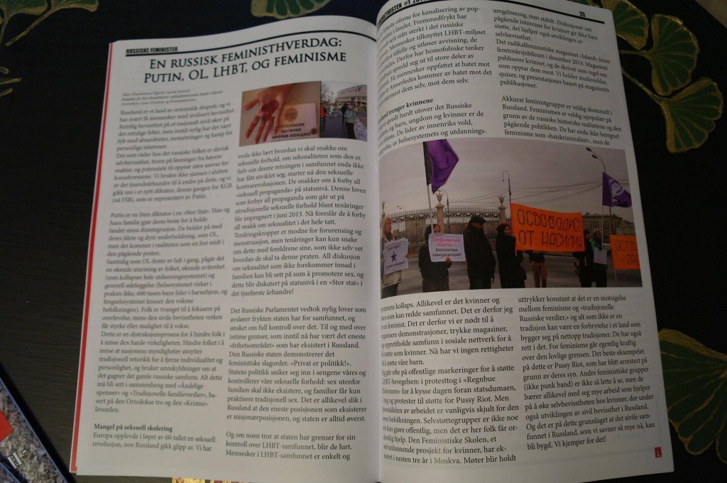I do go often to public rallies to support LGBTIQ: to protest marches in the «Rainbow column», to Kiss Day in front of the State Duma, to rallies and protests in support of Pussy Riot. But the main work is usually hidden from the general public. Self-support groups do not allow for publicity, but it is here where people get real help. The School of Feminism, a self-educational project for women, has existed for almost three years in Moscow. Meetings are held irregularly but steadily. Discussion of the issues of current interest to women doesn’t only provide support, it also helps for the development of self-consciousness. The radical feminist magazine «Island» will celebrate its fifteenth anniversary in December 2014. The magazine publishes women, and they usually write about what they care about. We conduct readings, quizzes and presentations based on the magazine publications.