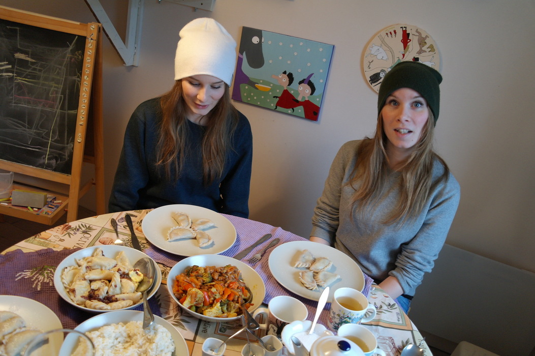Camilla и Jeanett приходили к нам в гости и, когда увидели вареники, слегка удивились. Но потом гости одобрили вареники, хотя я не знаю, что им больше понравилось — вишни или с картошка.