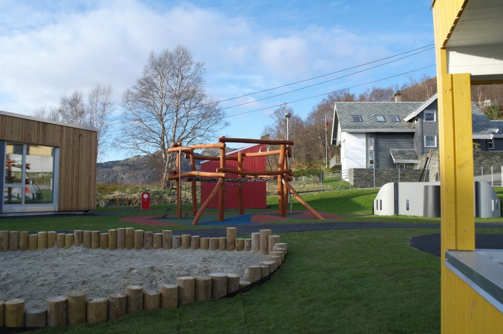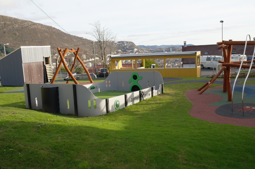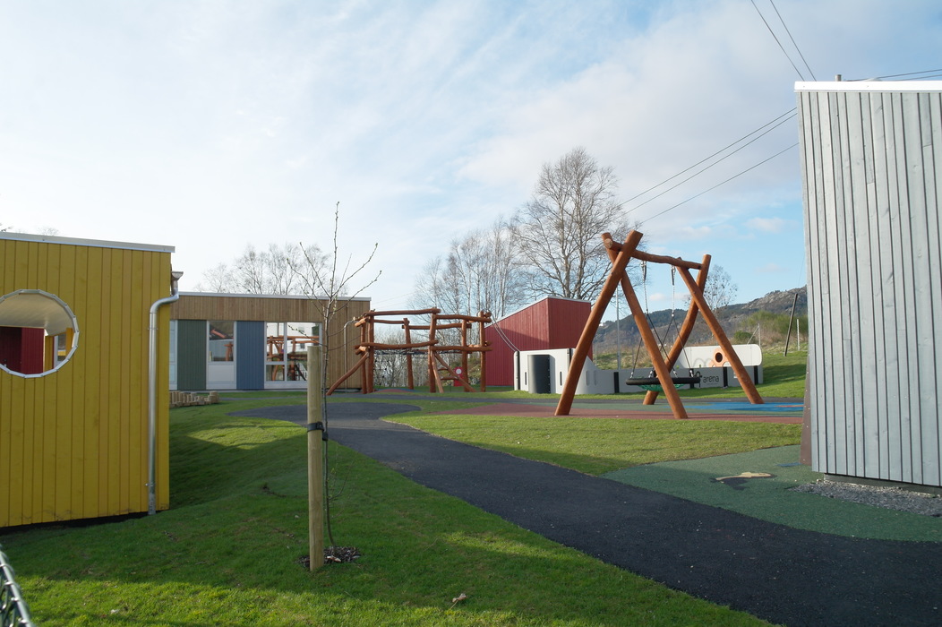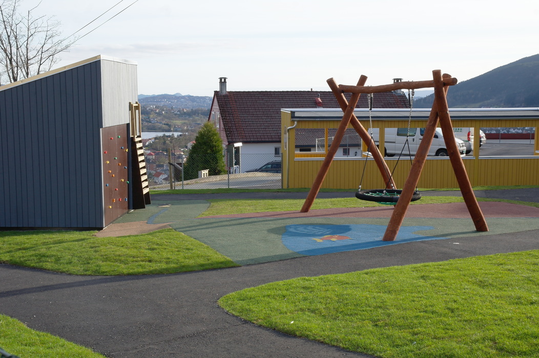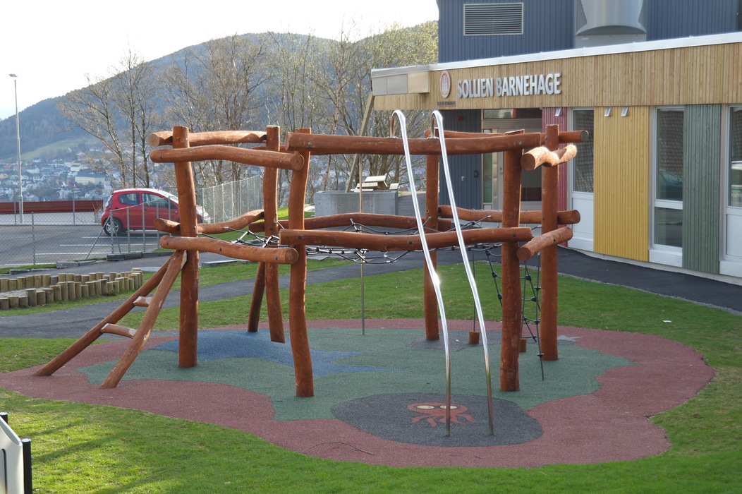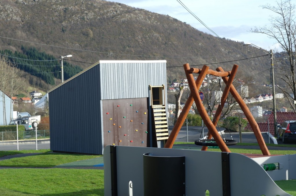 Этот сад мы с Терентием увидели, когда шли с горы Ульрикен домой. Мы сфотографировали площадку, парковку и дома вокруг, а также вид на центр города, который открывается со смотровой недалеко от детского сада. Конечно, это не самый идеальный сад — он находится прямо на автодороге и территория сада не очень велика. Но всё равно есть на что посмотреть и чему удивиться.