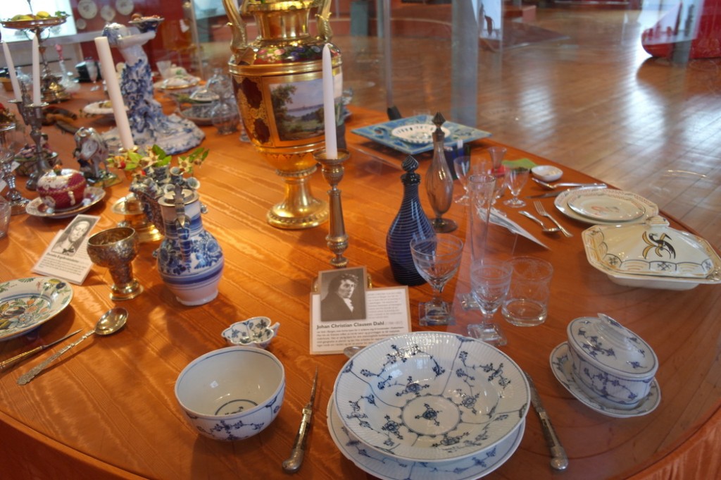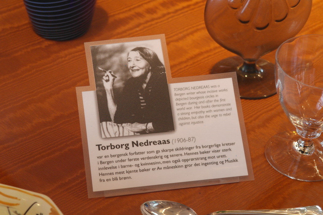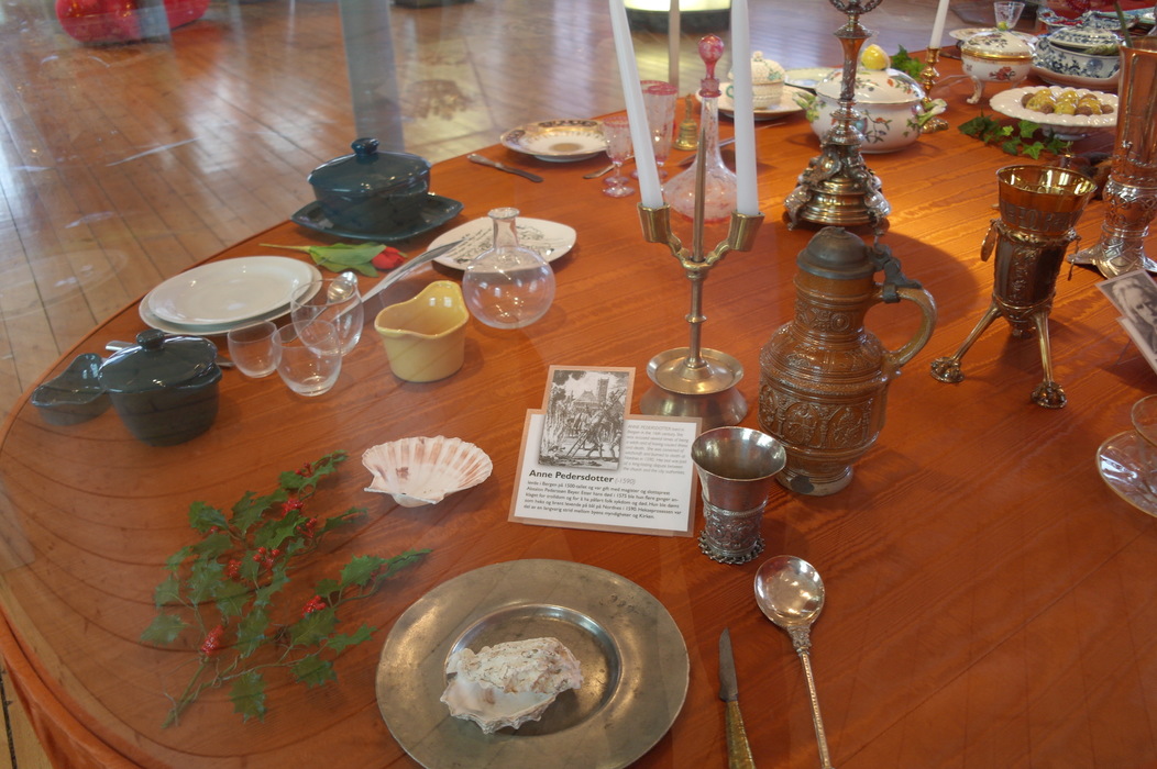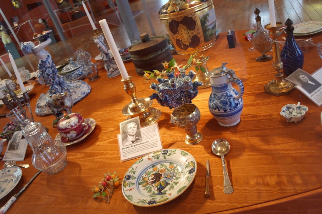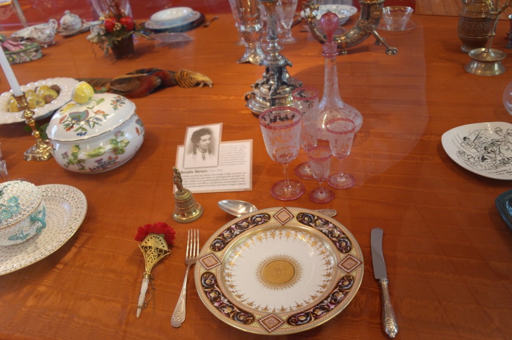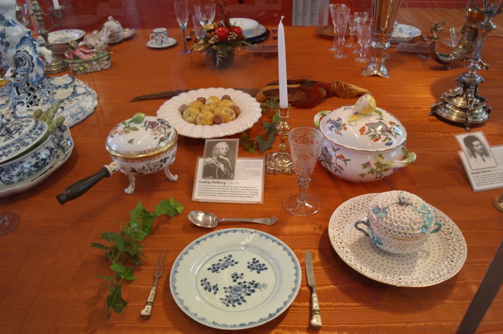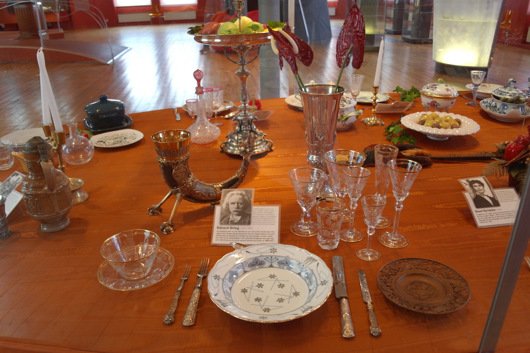 Исторический обед можно увидеть на выставке «Люди и вещи». За овальным столом расположились выдающиеся бергенцы. Биографии людей и историю нашего города рассказывают столовые приборы!