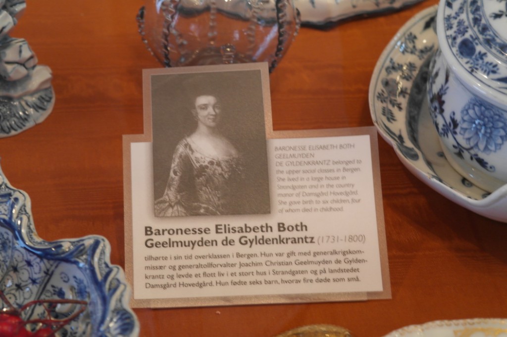 Baronesse Elisabeth Both Geelmyden de Gyldenkrantz — представительница норвежской аристократии, жила в Damsgård Hovedgård, деревянной усадьбе, фасад которой как раз во времена баронессы был украшен в стиле рококо. Элизабет родила шестерых детей, четверо из которых умерли в раннем возрасте. В википедии можно прочитать о муже Элизабет, которого звали Joachim Christian Geelmuyden. В этом сезоне музей Damsgård закрыт.