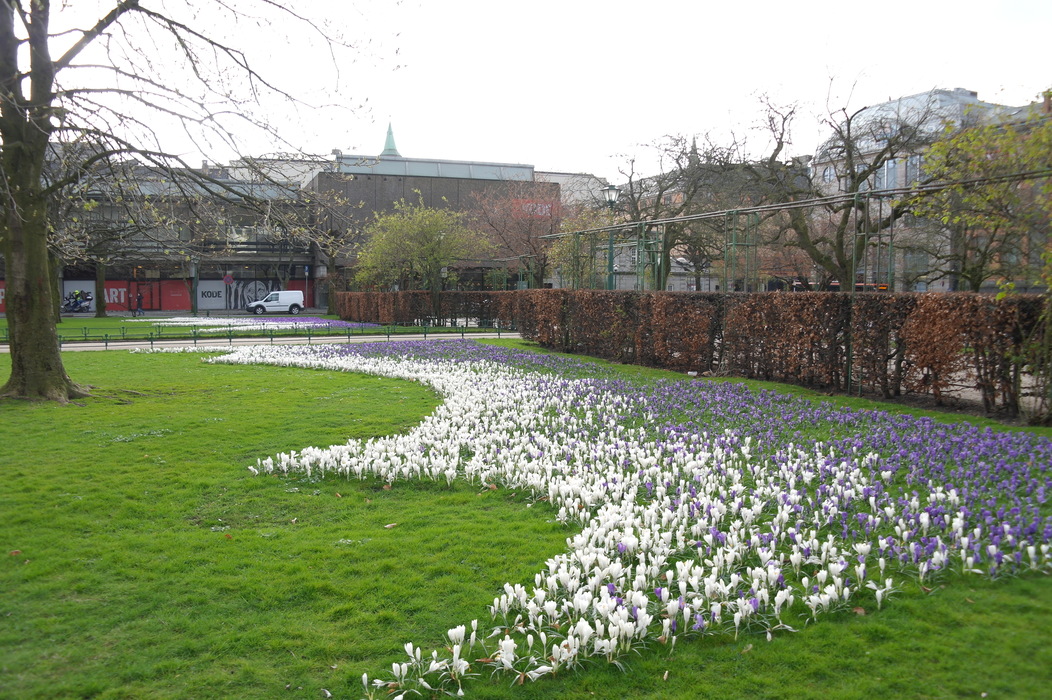 Около самой площади белые и фиолетовые крокусы, а около музея есть поляна с желтыми крокусами.