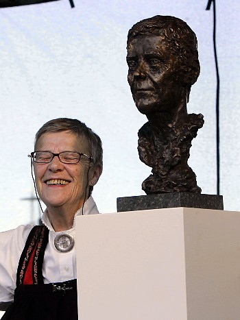 На фотографии — Tone Hellesund, лидер проекта Skeivt arkiv, а также førstebibliotekar в библиотеке Бергенского Университета. За спиной Туне — квир-архив, который занимает комнату в библиотечном здании на Haakon Sheteligs plass 7. Tone Hellesund — автор единственной в Норвегии докторской диссертации о квир-женщинах.