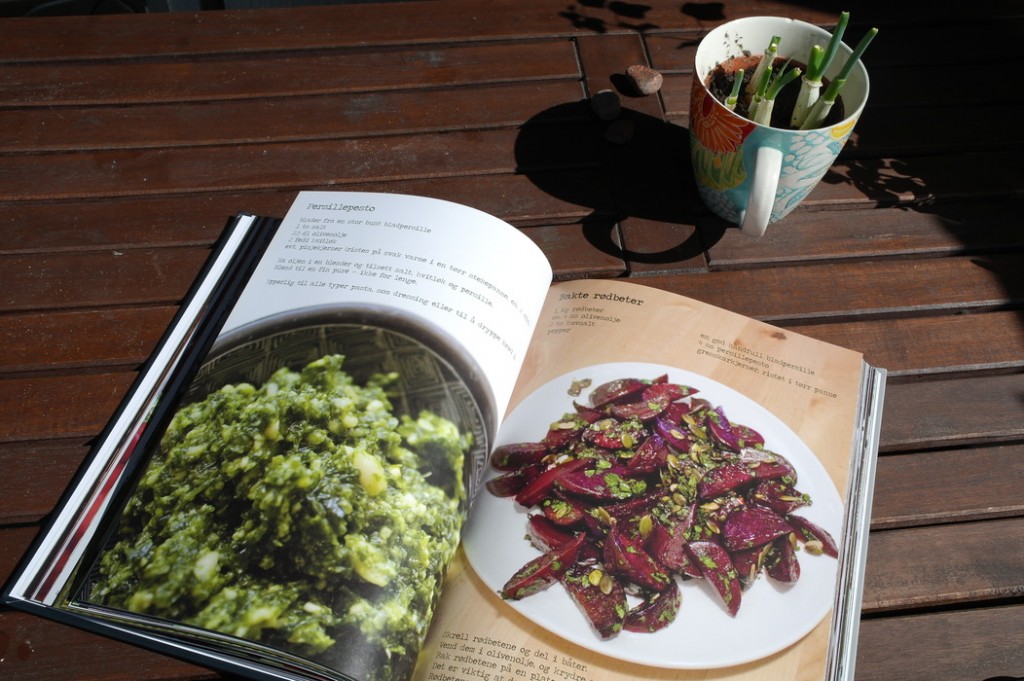 Для коллективов предлагается много рецептов. Я покажу лишь те, которые вы совсем не ожидаете увидеть в анархо-книге. Слева — песто из петрушки, чеснока и кедровых орехов, (конечно, с оливковым маслом), а справа жареная свеколка (конечно, с оливковым маслом). И если вы к этому времени приобрели уверенность, что оливковое масло в Норвегии самое дешевое или доступное кому-то кроме среднего класса — нет, это определенно не так.