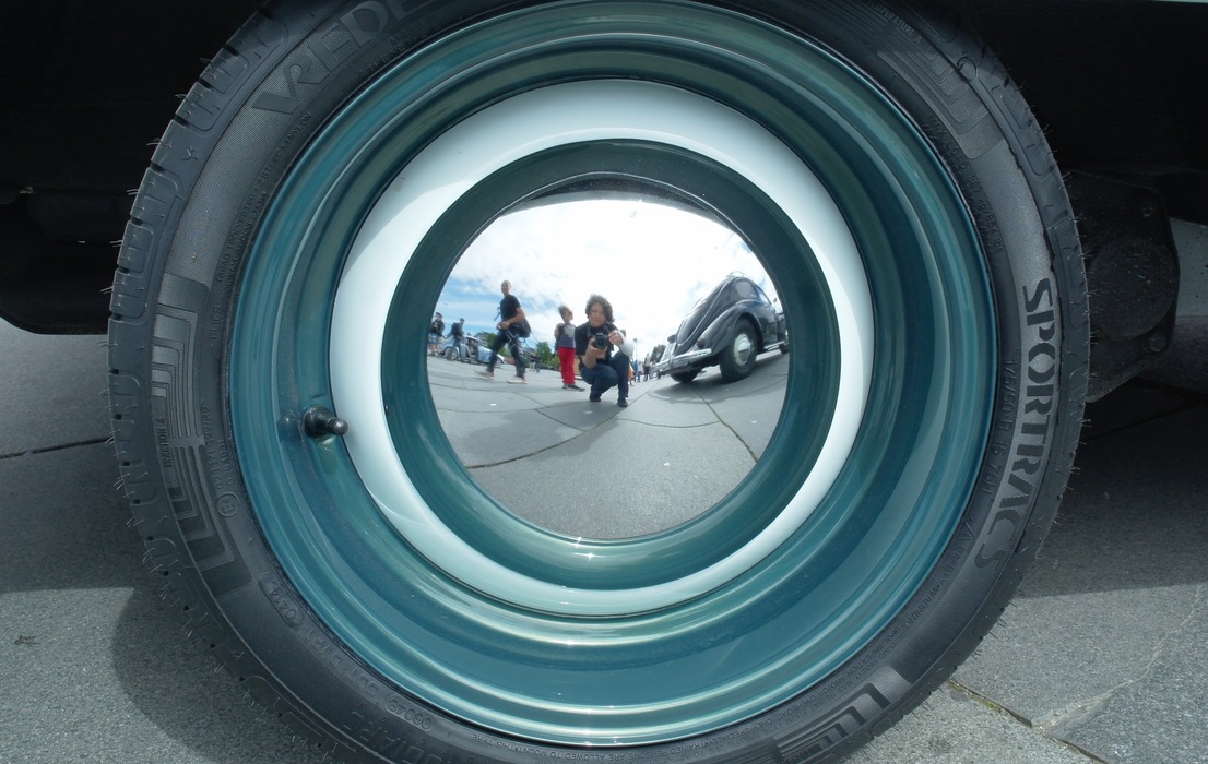 Зеркальное колесо одного из призеров выставки. Смотрите на великолепные машины бергенских энтузиастов-автолюбителей.