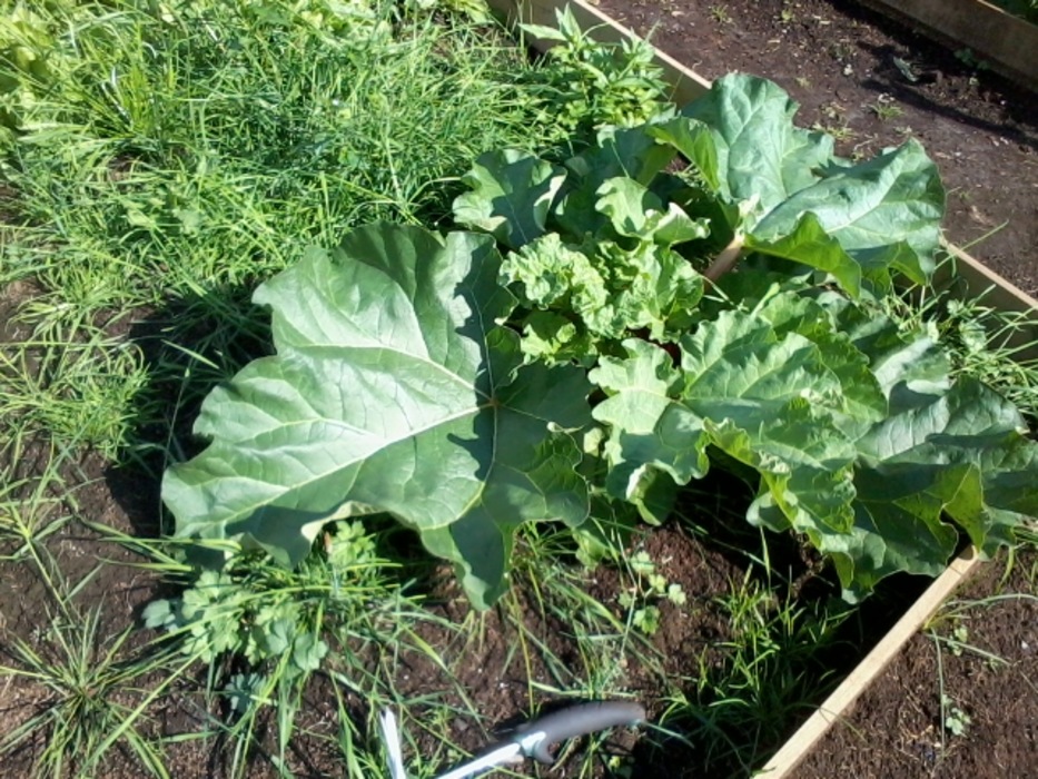 Пока завязалось 4 тыквы и все они прикрепились к земле дополнительными корнями (белый корень очень хорошо видно под цветком на фото выше). У соседей, которые сажали взрослые растения из магазина, на одном кусте по десять огромных кабачков, а у некоторых тыквочки примерно нашего размера. Ревень на нашем участке самый крупный, но это потому что он долго рос на балконе, а соседи сажали однолетки.