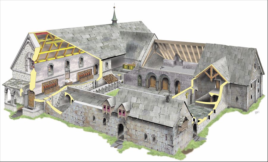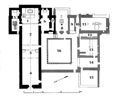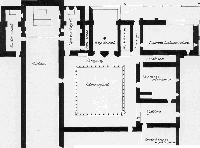 9 Samtalerom (комната для разговоров) 10 Gang 11 Dagrom 12 Nattrapp 13 Spisesal (столовая) 14 Kjøkken (кухня) 15 Matsal, leke 16 Klostergård (монастырский двор) |