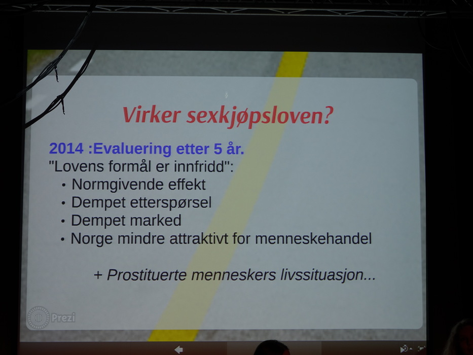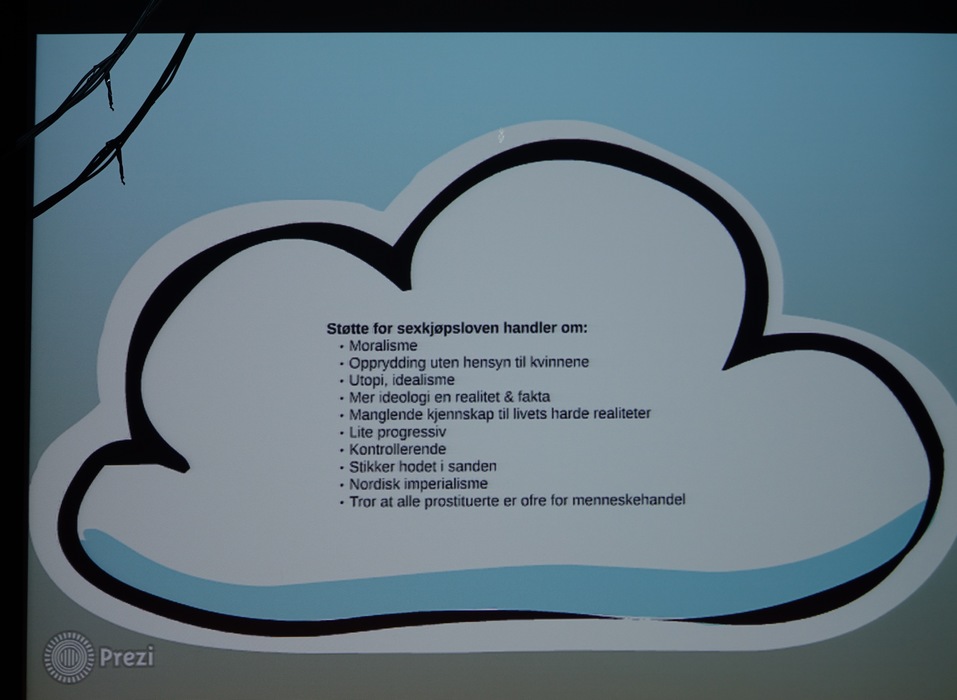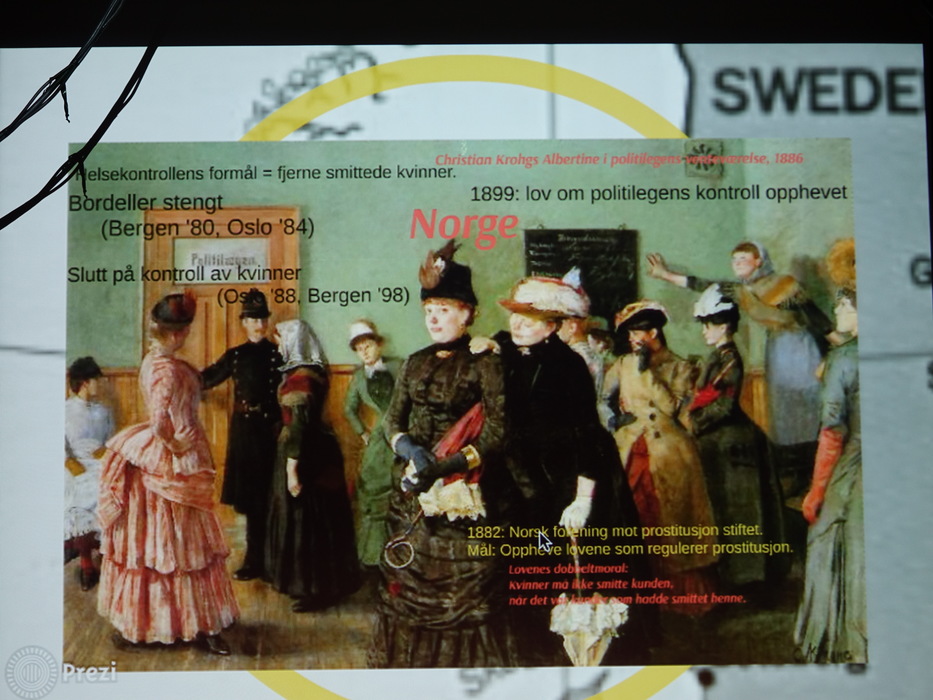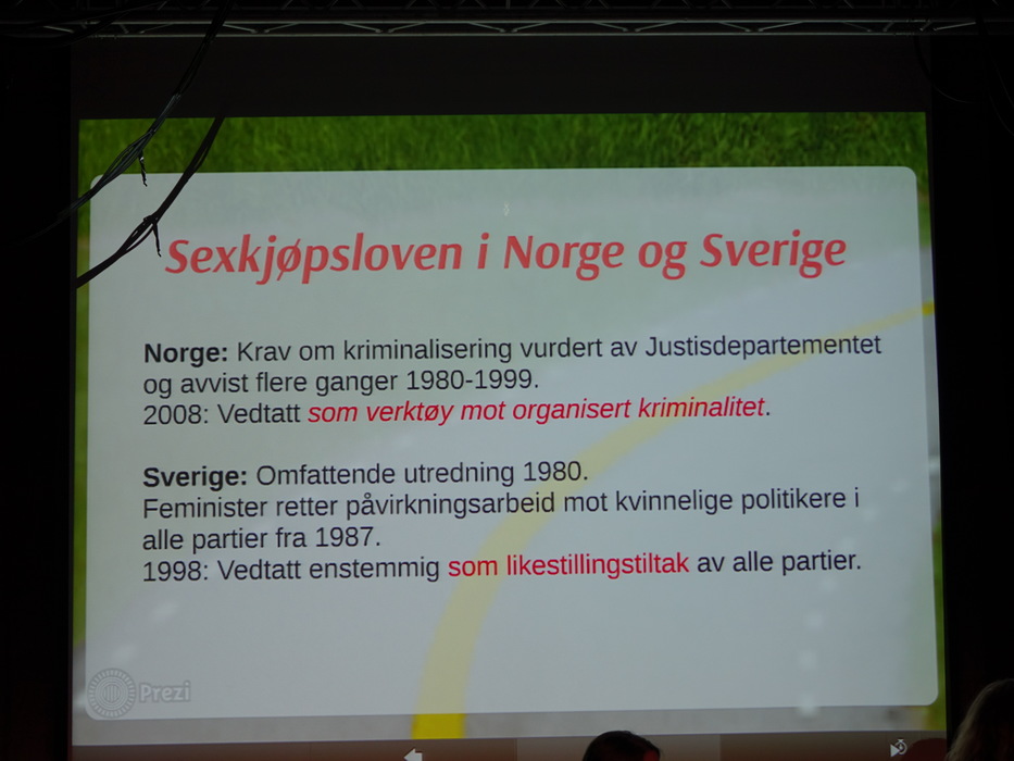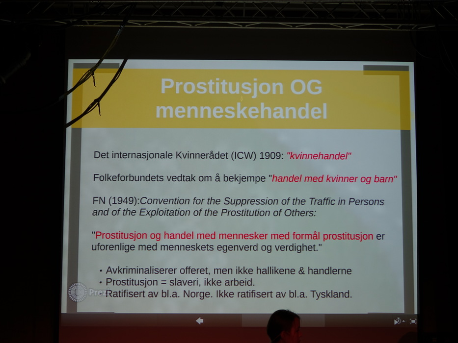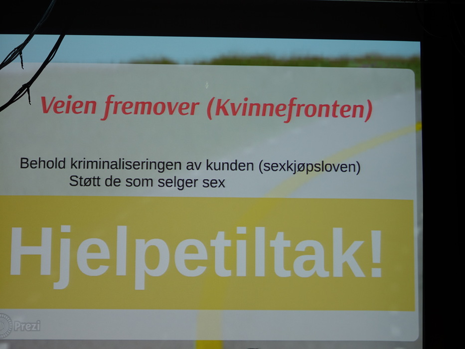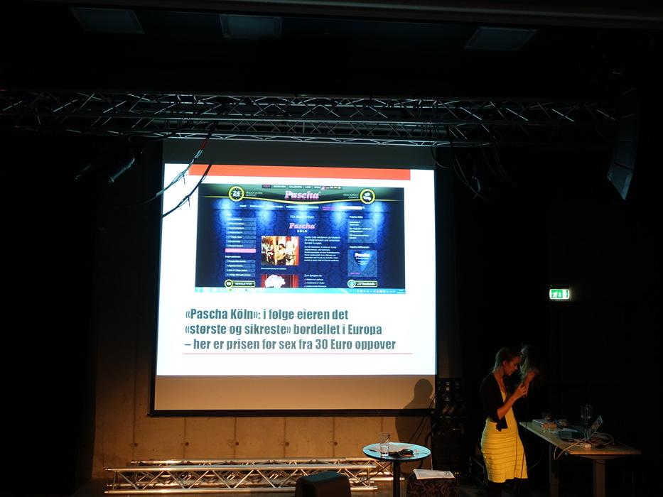 Лекторов было двое: Hilde Jakobsen и Katharina Sass. Норвегия (и другие скандинавские страны) идеологически противостоят Германии, занимают полярные позиции по вопросу продажи и покупки секса. Норвежцы считает продажу секса разновидностью продажи человека, немцы — разновидностью работы. Я придерживаюсь скандинавского мнения.
