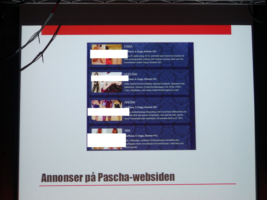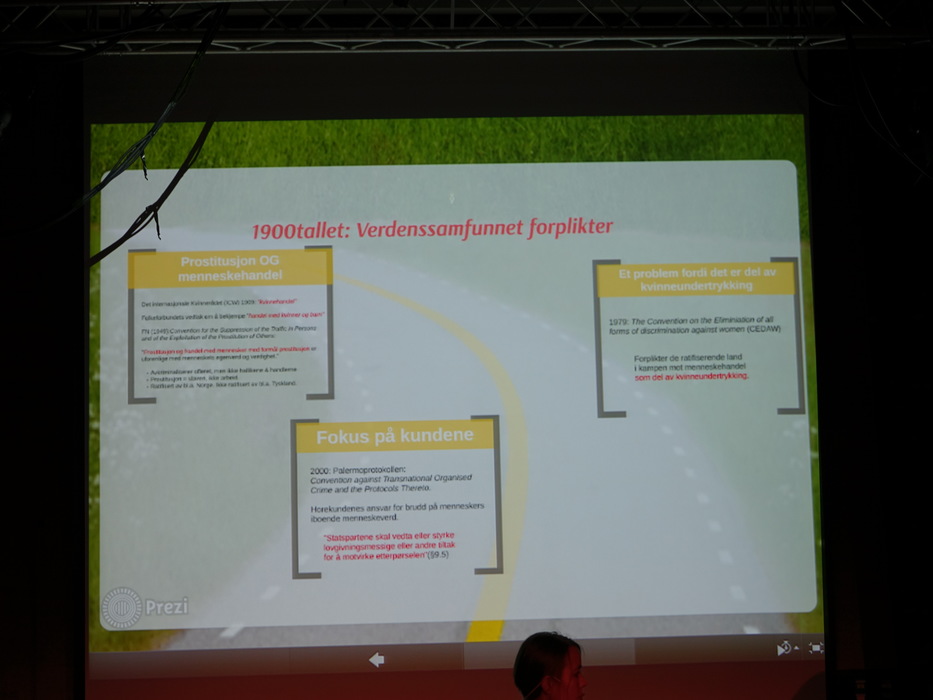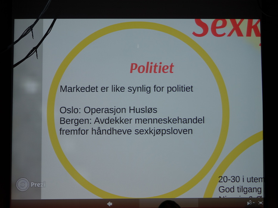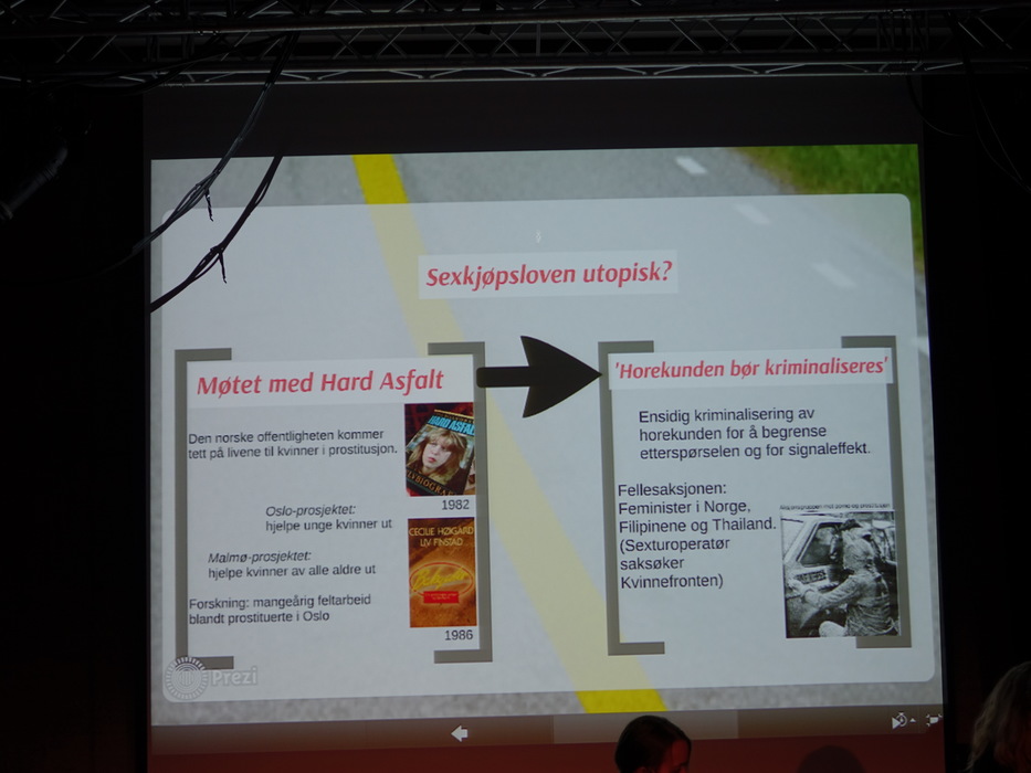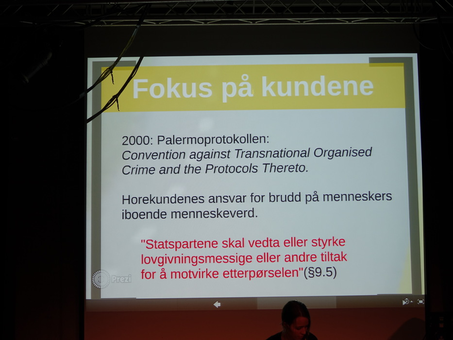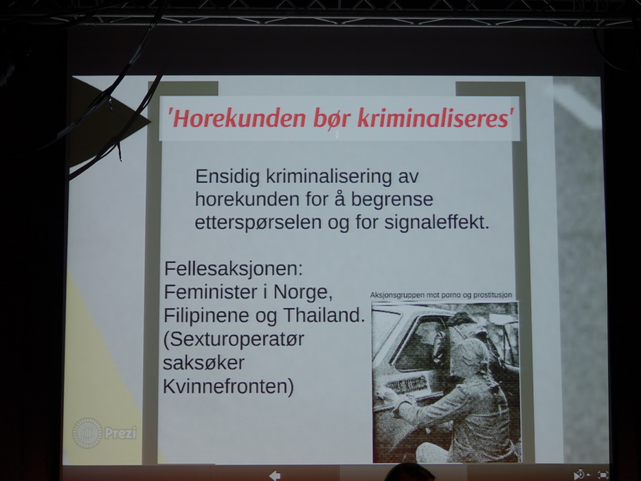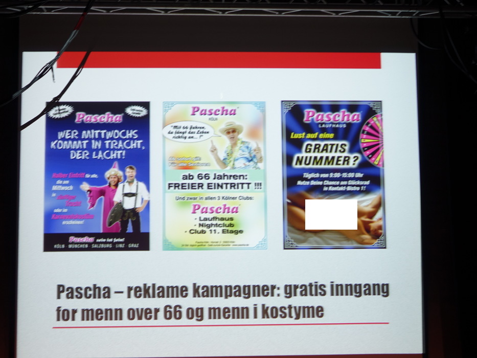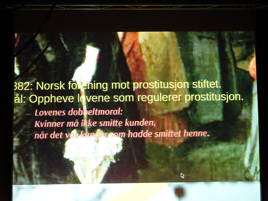Лекторов было двое: Hilde Jakobsen и Katharina Sass. Норвегия (и другие скандинавские страны) идеологически противостоят Германии, занимают полярные позиции по вопросу продажи и покупки секса. Норвежцы считает продажу секса разновидностью продажи человека, немцы — разновидностью работы. Я придерживаюсь скандинавского мнения.