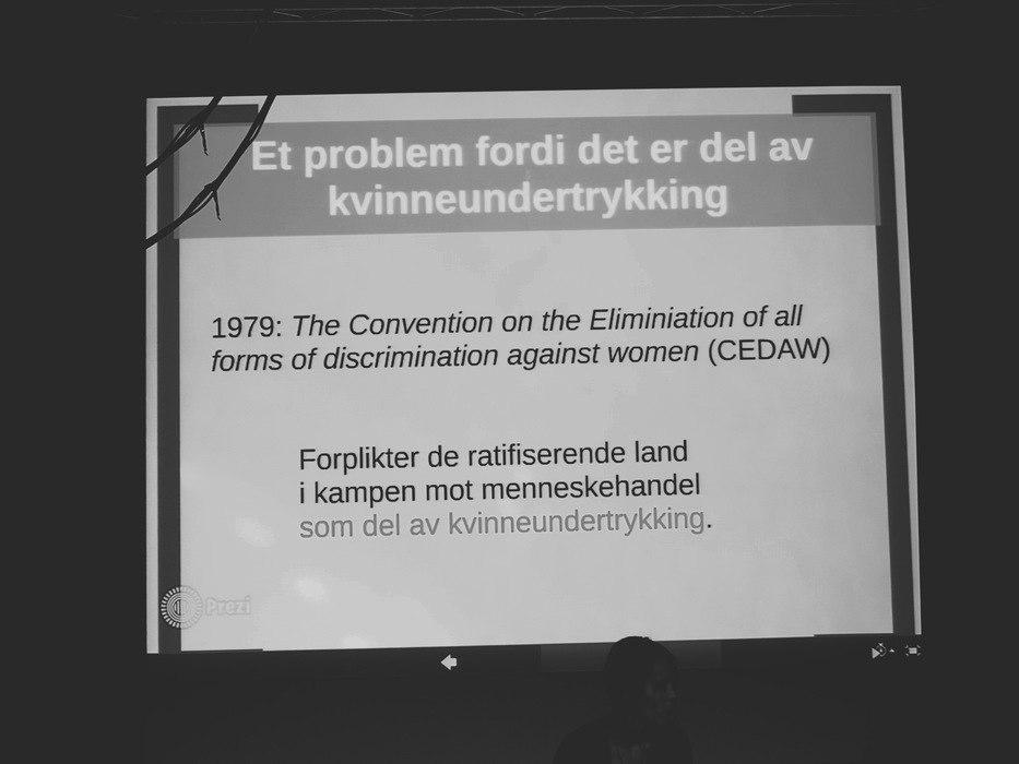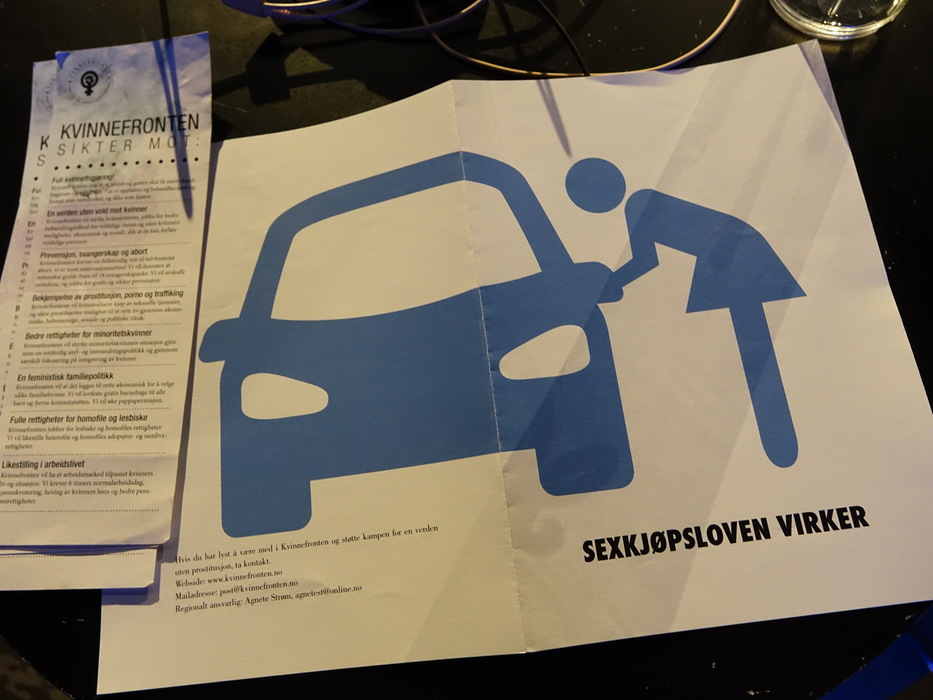 Перед началом лекции Хильде рассказала про фем-организацию Kvinnefronten (Женский фронт). В аудитории раздали листовки «Закон о покупке секса действует»: