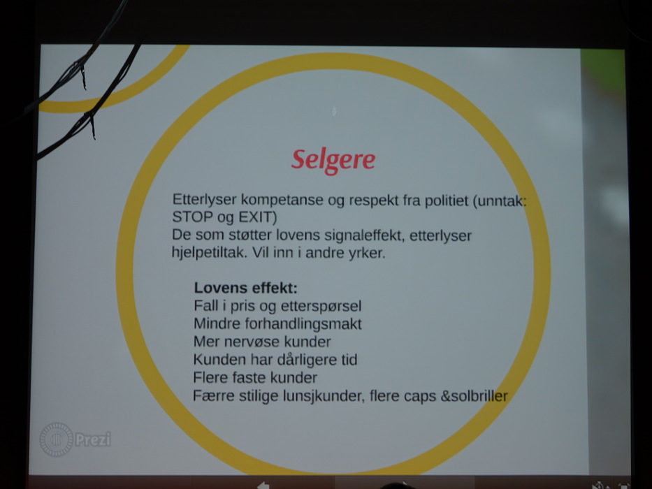 Норвежское общество изменило приоритеты и стало еще более состоятельным во всех смыслах. Пришедшие к власти правые пытаются отменить новый норвежский закон, но феминистки прикладывают большие усилия чтобы этого не произошло. Общественные дебаты не прекращаются ни на один день. Вот лицо и высказывания одного из клиентов: «De er ikke folk i mine øyne». «Они не люди для меня,» — говорит он о проститутках.