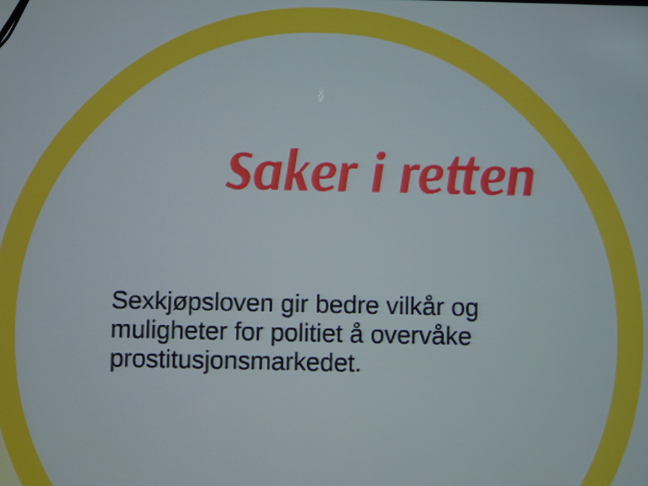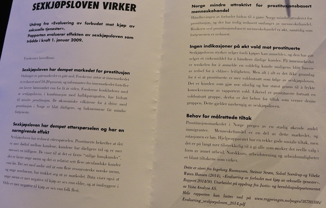 Из листовки (перевод вольный): «Закон о покупке секса, вступивший в действие 1 января 2009 года, вызвал падение цен(на 45-60%), редукцию индустрии на 10-20%, уменьшение доли доходов от уличного рынка. Исследователи связывают это с действием закона и параграфа о сутенерах. Закон привел к снижению спроса, так как уровень стресса для покупателя вырос. Изменилась структура рынка — уменьшилось количество молодых мужчин-покупателей, увеличилось число женщин-иностранок. Молодые люди стали негативно относиться к покупке секса, изменилось отношение жителей Осло, которые стали воспринимать проституцию негативнее, чем остальные норвежцы. Норвегия стала менее привлекательной в качестве страны для работорговли, связанной с проституцией. Не наблюдается роста насилия по отношению к проституткам, так как на жестокого покупателя выгоднее донести в полицию. Но проституция остается индустрией, наполненной насилием и это не зависит от принятого закона. Людям, которые уходят из индустрии проституции, нужна серьезная поддержка — в том числе курсы норвежского языка, профессиональные курсы, достойные рабочие места.