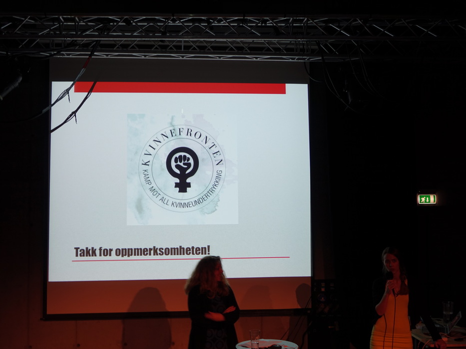Лекторы представляли организацию Kvinnefronten. На самом деле это не единственная наша феминистская организация. Но «фронтом» в метафорическом смысле следует называть всех феминисток Норвегии. Это название — фронт — показывает реальную ситуацию: здесь, на севере, живут женщины, которые держат оборону и у которых получилось то, что не удавалось никому прежде — сокрушить многовековую систему торговли женскими телами. Никто не знает, как долго продержится женский фронт.
