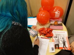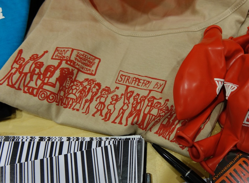 Информационный столик: феминисткий календарь, антистриптиз-футболки, журнал Ottar, брошюра и стикеры Стоп Порнокультура, петиция о запрете продавать алкоголь в стрип-клубе Дримс.