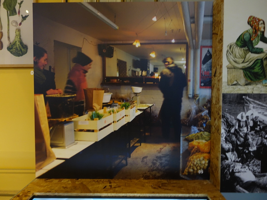Часть выставки говорит о слоу-фуд, приводит высказывания людей, считающих неразумным транспортировку и упаковку овощей-фруктов в пластик, желающих выращивать и приобретать местную еду — например, вступая в потребительский кооператив. На следующем фото одно из отделений Københavns Fødevarefællesskab (KBHFF) food co-op.