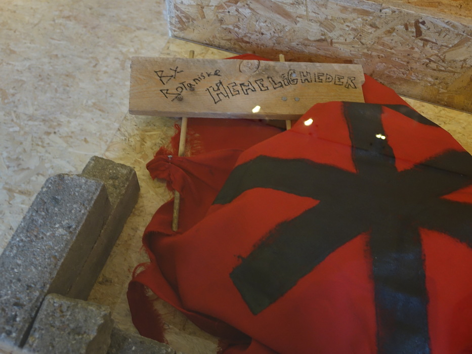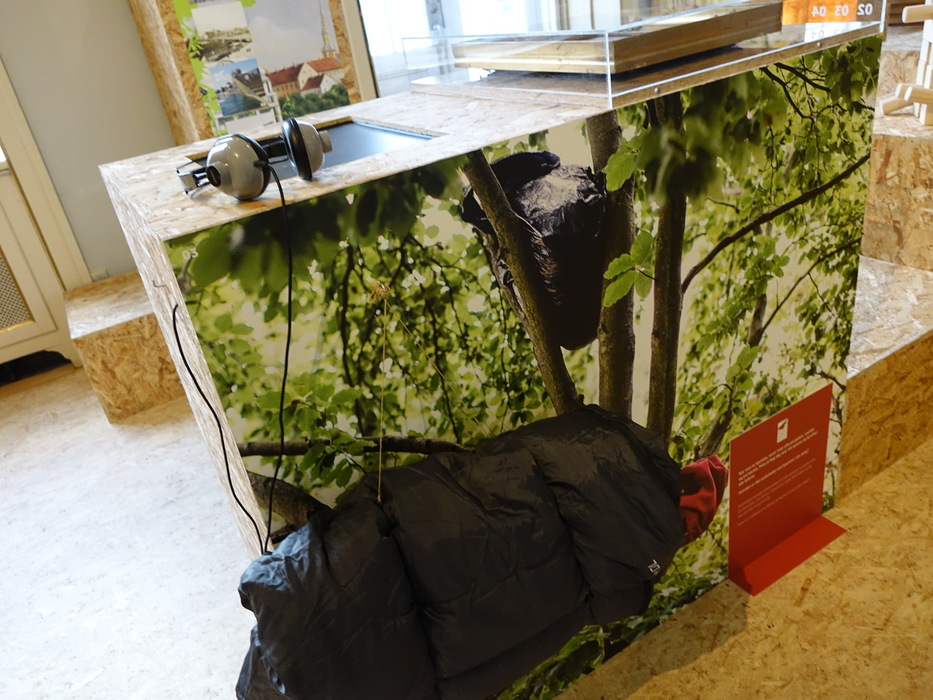 Стенд о бездомных. Посетителю предлагается поразмышлять о различиях в уровнях жизни, подумать о том, чем отличается сон в спальном мешке на улице, в парке или на лавочке от сна в собственной кровати.