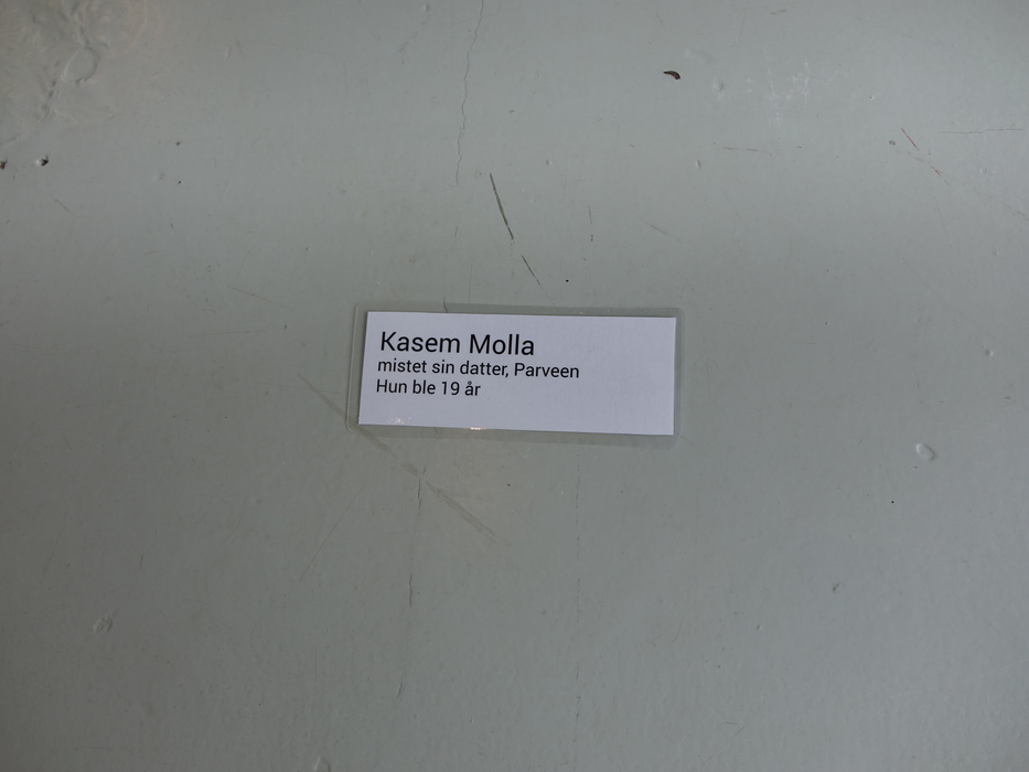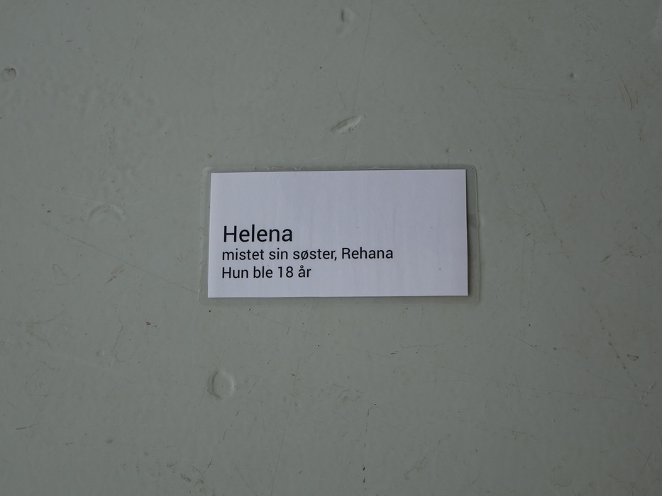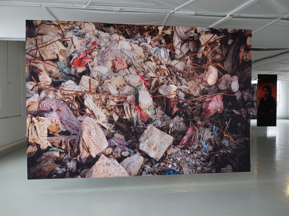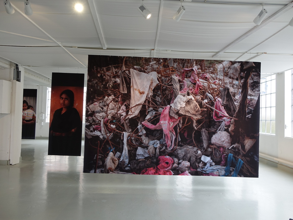 Я ожидала, что в Сальхусе будет похожая экспозиция. Но всё было решено по другому. Фотографии для бергенской выставки напечатаны на огромных холстах, две — лежат на полу. Посетитель может почувствовать себя на месте трагедии, среди родственников погибших, увидеть под ногами обломки фабрики, кости жертв.