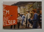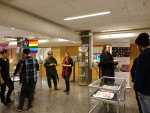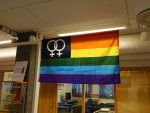 -> Clio Pe, Ørjan Lien, Siv Taule, Johan Knutsen на фоне баннера, который сделала правозащитница и и лидер Квир-архива Tone Hellesund