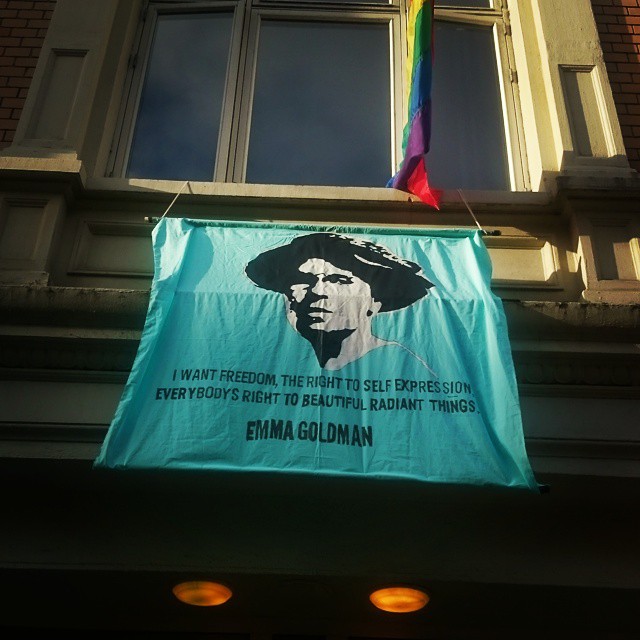 Они идут дальше по ново-названной улице Гудрун Шиман до Strandgaten, которая через минуту будет называться Simone Veil-smauet в честь французского юриста и политика, пережившей концентрационные лагеря во время Второй мировой войны. Ветер и капли дождя, кажется, никого не беспокоят до тех пор, пока не закончатся плакаты. Вечером будет концерт в Fincken, результат сотрудничества с политической организацией ПротивВластиБерген. Под радужным флагом, который гордо развевается на ветру, висит портрет Эммы Голдман и цитата: «I want freedom, the right to self-expression, everybody’s right to beautiful radiant things».