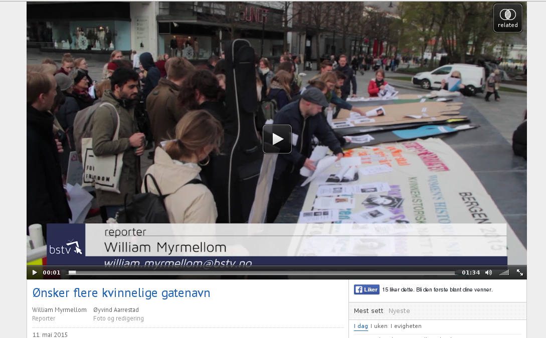 Репортаж для бергенского студенческого телевидения «Ønsker flere kvinnelige gatenavn» сделали William Myrmellom и Øyvind Aarrestad. Репортаж был опубликован 11 мая 2015 года