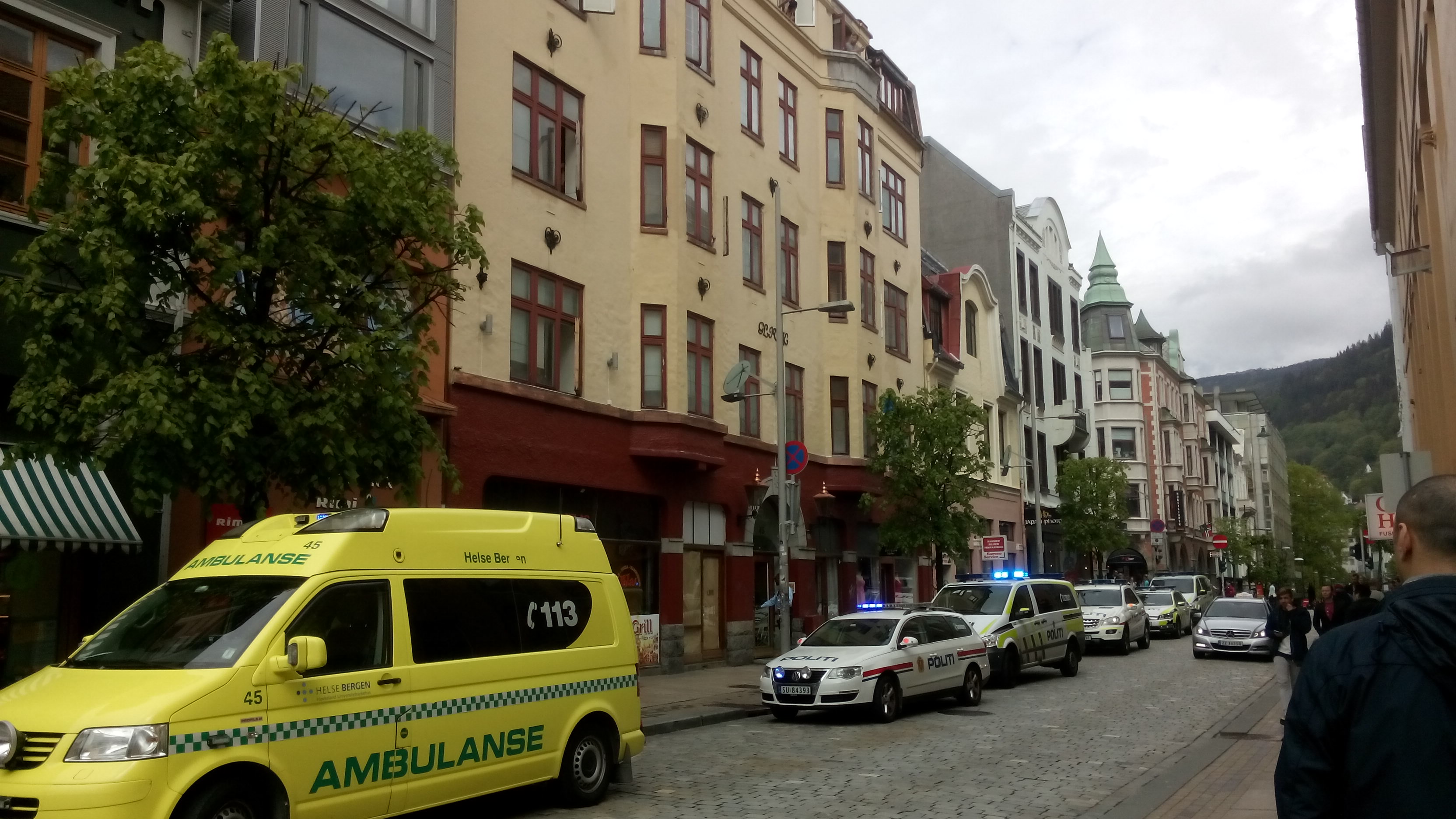 По словам очевидца событий,  Hoshyar Ebrahimi, около 13.00 36-летний мужчина в невменяемом состоянии кричал, пытался убить других людей. Всё происходило в самом центре города, недалеко от студенческого центра и магазина Кинсарвик, в подъезде справа от курдского кафе на Nygårdsgaten. Я видела, как в 13.04 приехали 5 полицейских машин и одна скорая.  На улице стояла большая толпа людей, люди следили за действиями полиции из всех окон близлежащих домов. Десять вооруженных полицейских зашли в здание. Окровавленный мужчина был госпитализирован в 13.10. Я ничего не нашла в газетах про это происшествие.