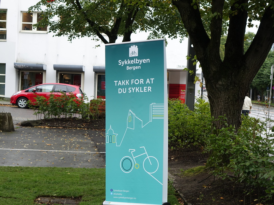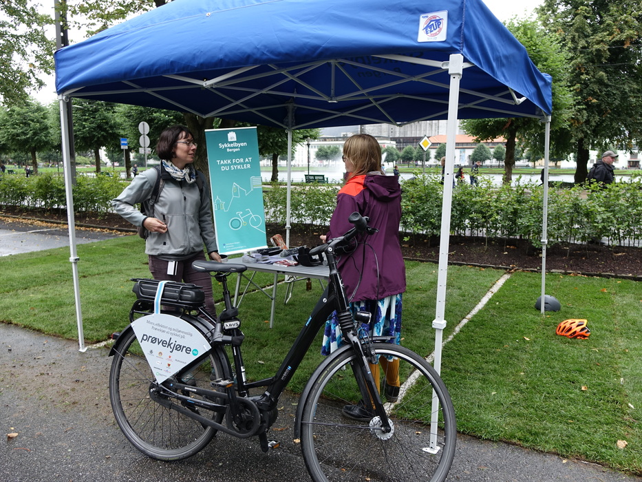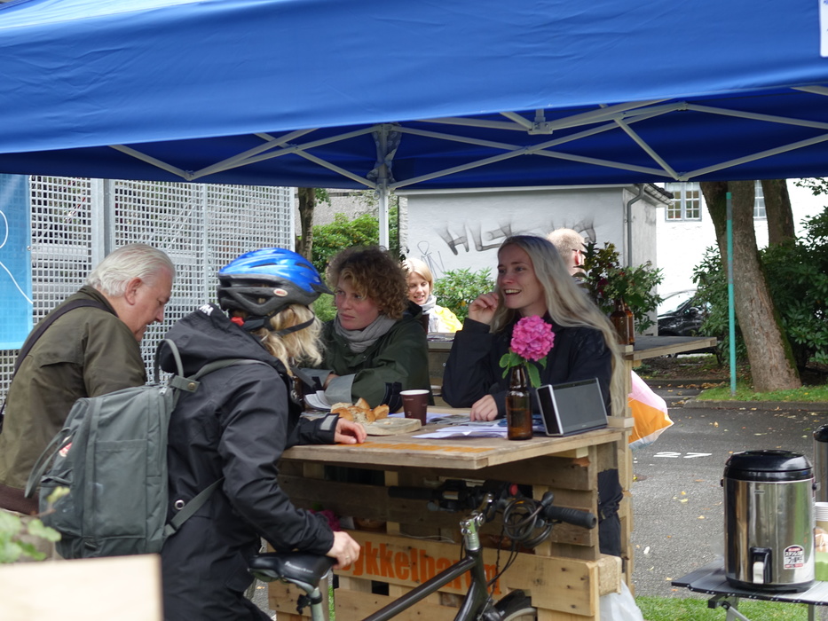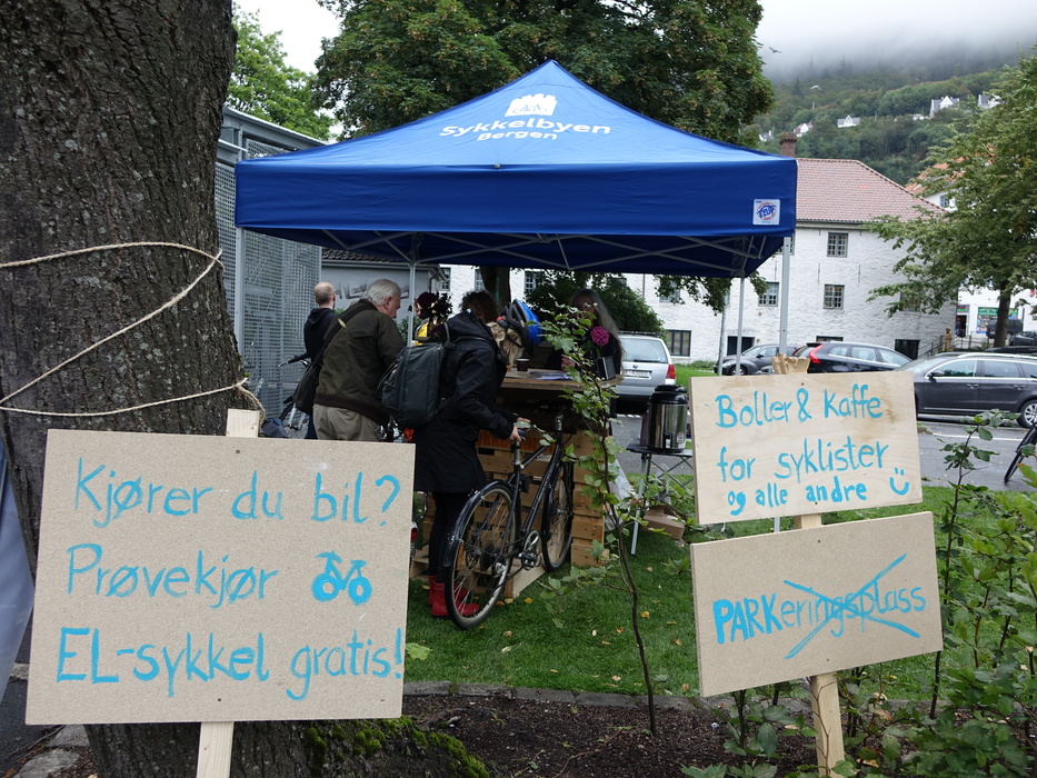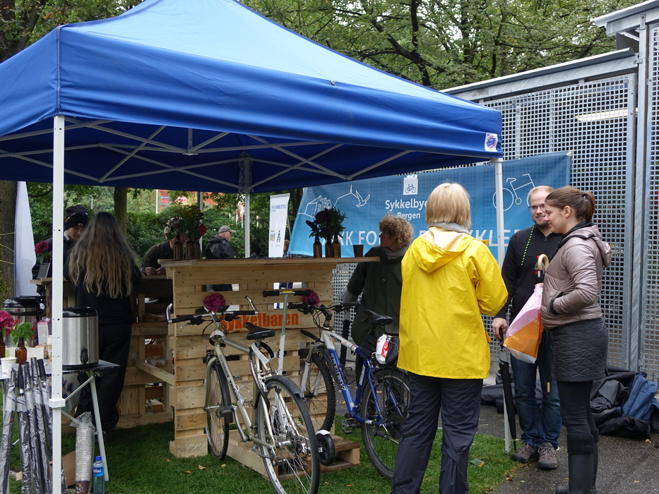 18-071Сегодня днем около велопарковки бергенского горсовета активисты из группы Велогород Берген Sykkelbyen Bergen угощали прохожих чаем и кофе, раздавали карты велодорожек, велошарфы и зонтики со светоотражателями, а также предоставляли возможность прокатиться на электрическом велосипеде.
